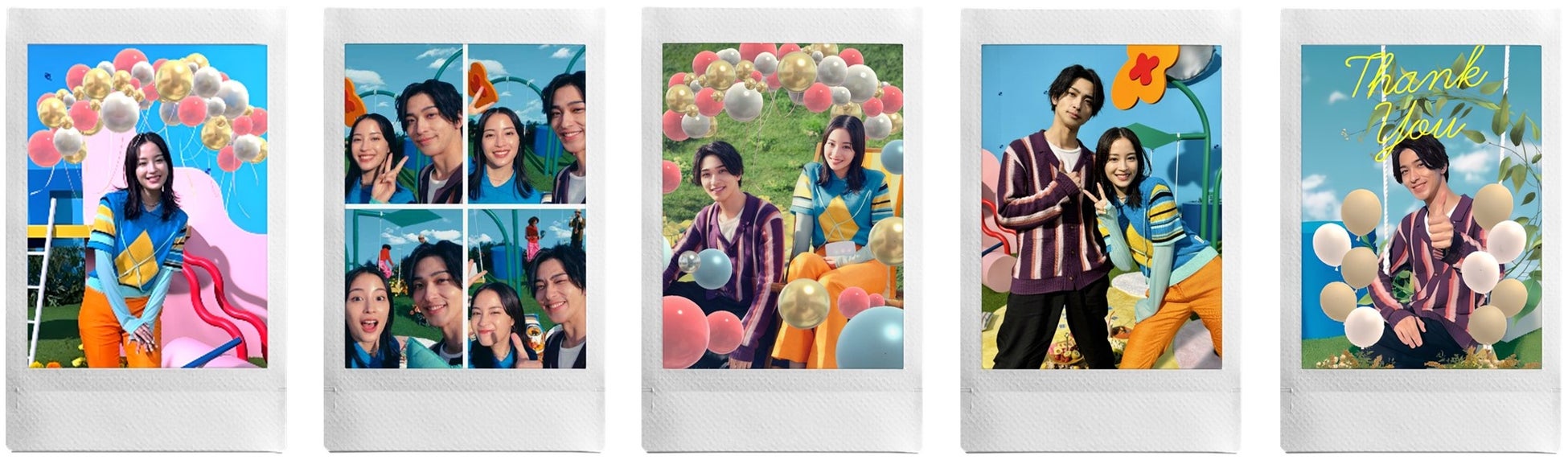 友人と一緒にピクニックをする広瀬さんと横浜さんが、「instax AiR Studio™」機能でバルーンなどのARエフェクトを空間に浮かべることでオリジナルの世界観で写真撮影を楽しみます。また、「Click to Collage」機能で連続撮影した2ショット画像を「Link 3」でチェキプリント™にして楽しむなど、笑顔あふれるお二人の様子にご注目ください。