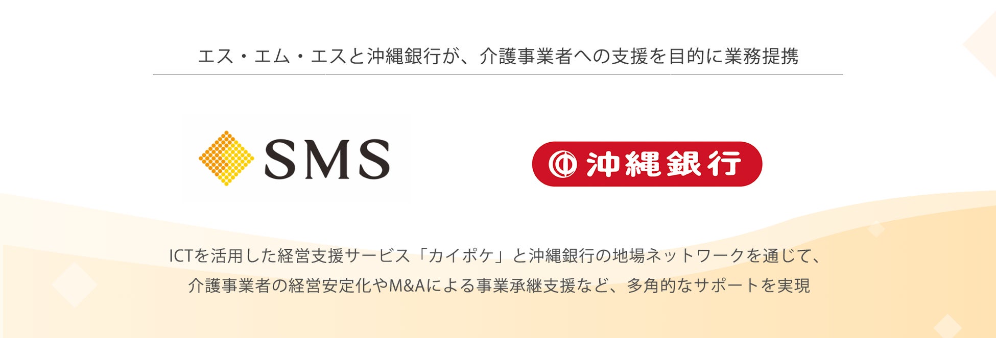 株式会社エス・エム・エス(本社:東京都港区、代表取締役社長:後藤夏樹、東証一部、以下「当社」)は、この度、介護事業者への経営支援を目的に、株式会社沖縄銀行(本店:沖縄県那覇市、取締役頭取:山城正保、以下「沖縄銀行」)と業務提携し、当社が提供する介護事業者向け経営支援サービス「カイポケ」の紹介や、介護事業者の事業承継ニーズに対する案件紹介について相互に連携を開始します。