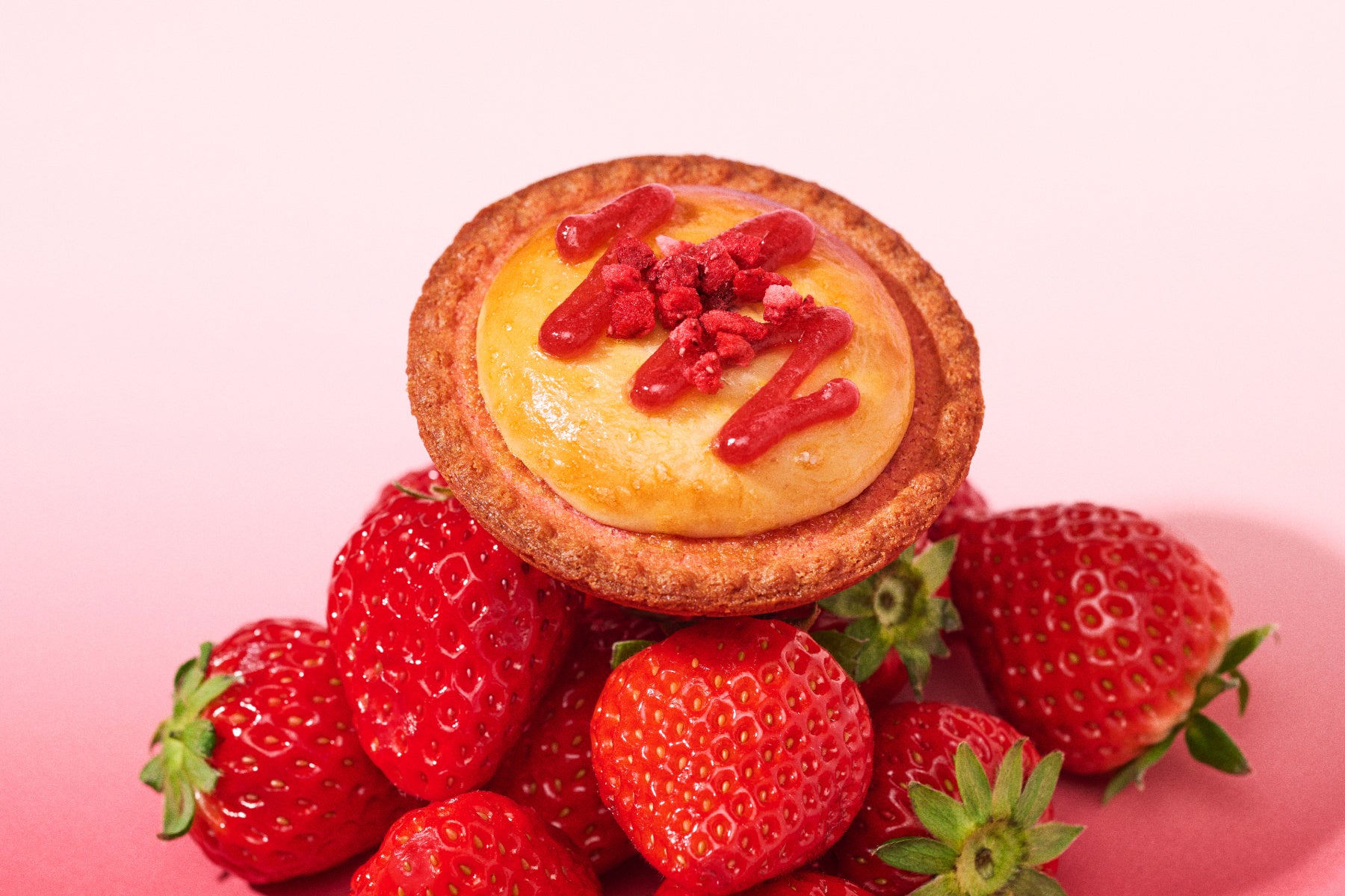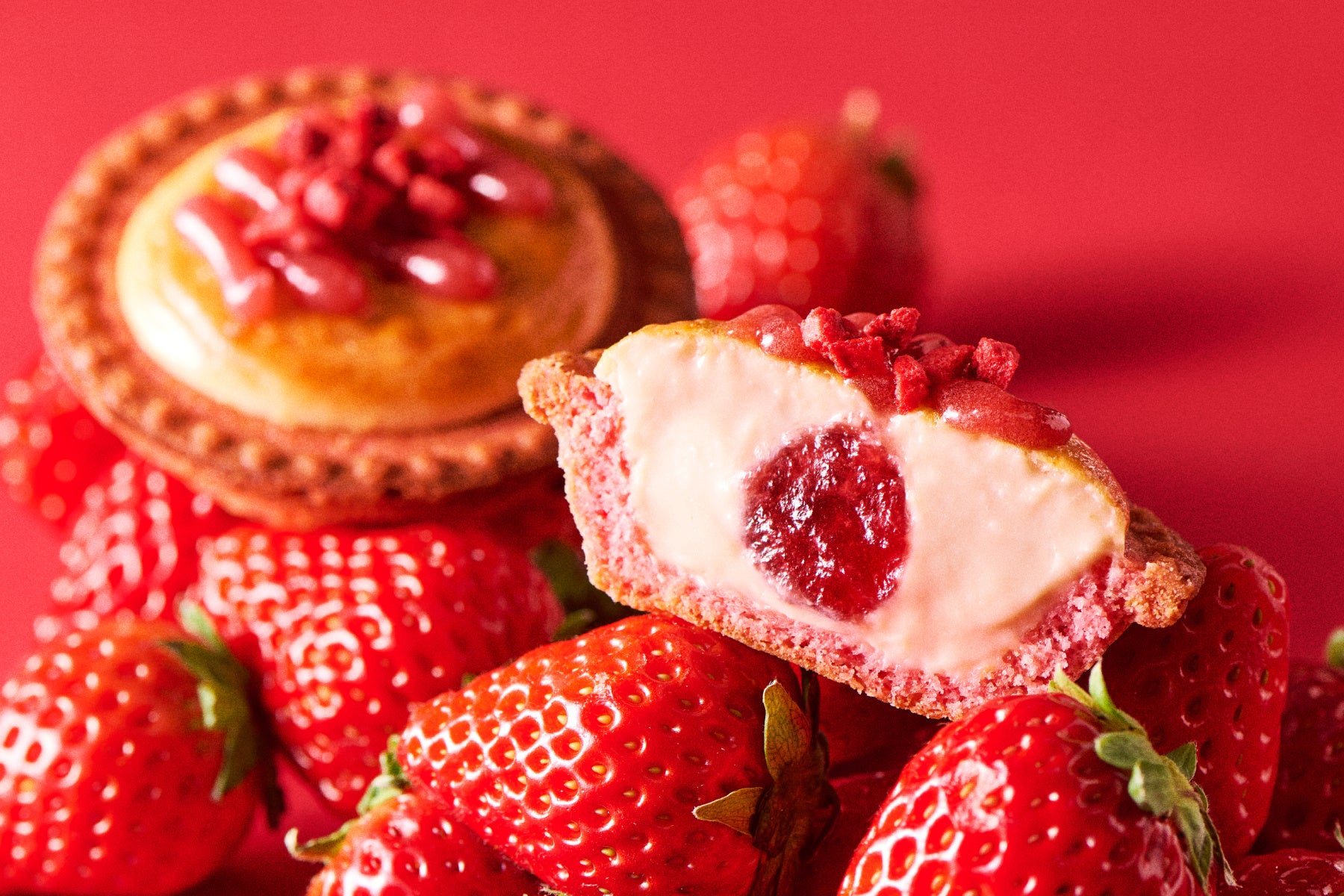 濃厚で甘酸っぱい、あまおう苺(※)たっぷりの贅沢チーズタルトです。福岡県産のあまおう苺を使用した苺果汁と、爽やかな酸味が特徴のいちごピューレを練りこんだチーズムースに、果肉感を残したあまおう苺ジャムを絞り、甘酸っぱい苺をひとくちで贅沢に堪能できるように仕立てました。あまおう苺ジャムといちごのフリーズドライをトッピングで、より濃い苺の味わいを演出します。