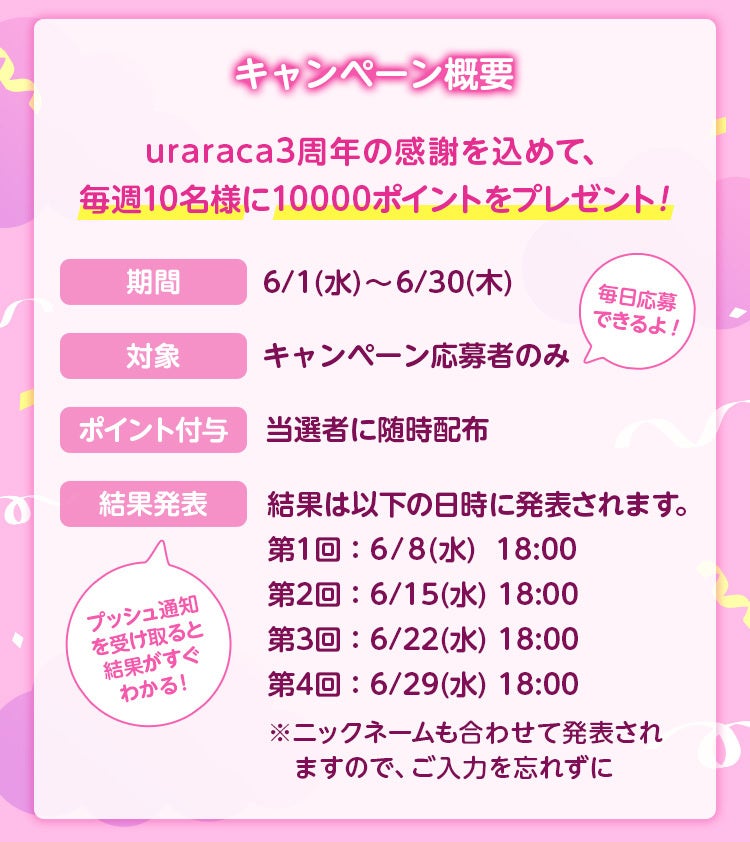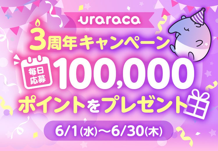 uraracaリリース3周年の感謝の気持ちを込めて、毎週抽選で10名様にアプリ内で使えるポイント【10,000pt】をプレゼントいたします。