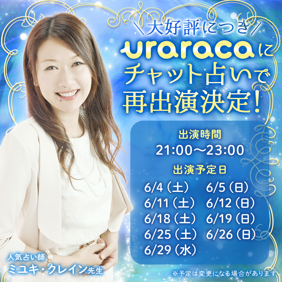 絶大なる人気を誇る占い師「ミユキクレイン先生」が、uraracaチャット占いで期間限定出演します。
