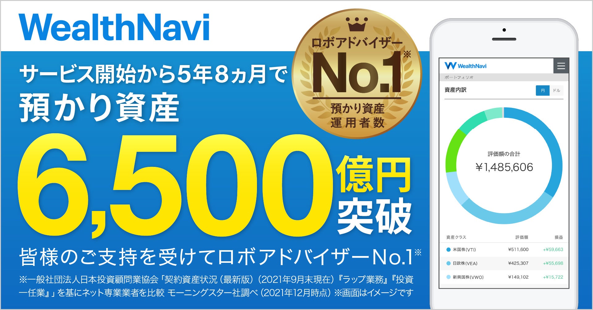預かり資産・運用者数 国内No.1ロボアドバイザー(※)「WealthNavi(ウェルスナビ)」を提供するウェルスナビ株式会社(本社:東京都渋谷区、代表取締役CEO:柴山和久、以下「当社」)は、2016年7月の正式リリースから約5年8カ月となる2022年3月25日時点で、預かり資産6,500億円を突破したことをお知らせします。