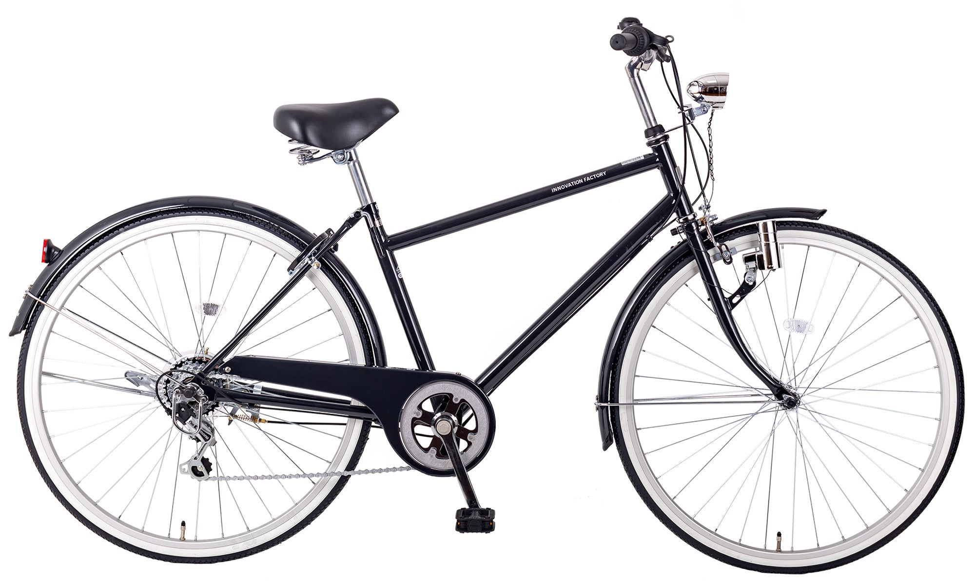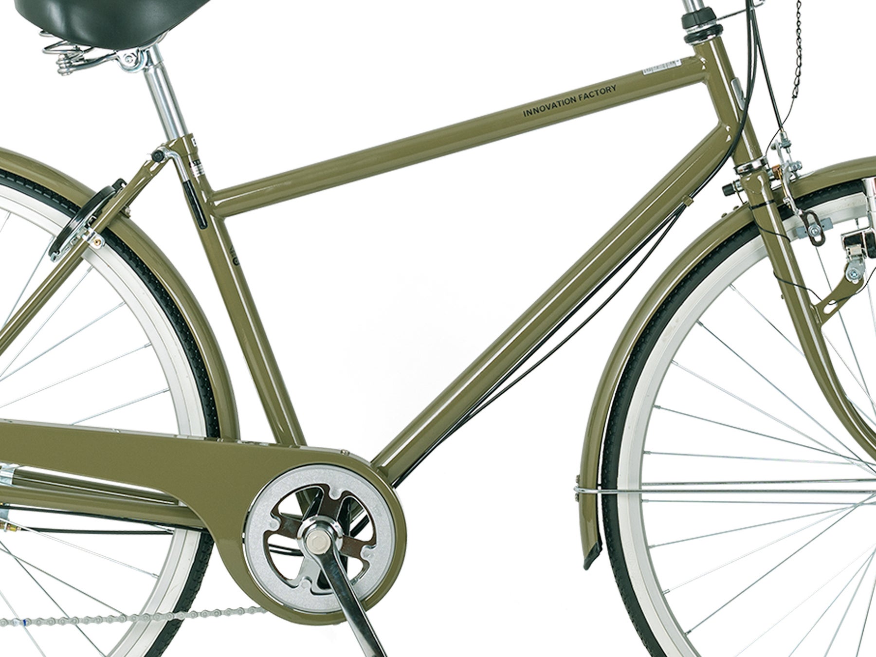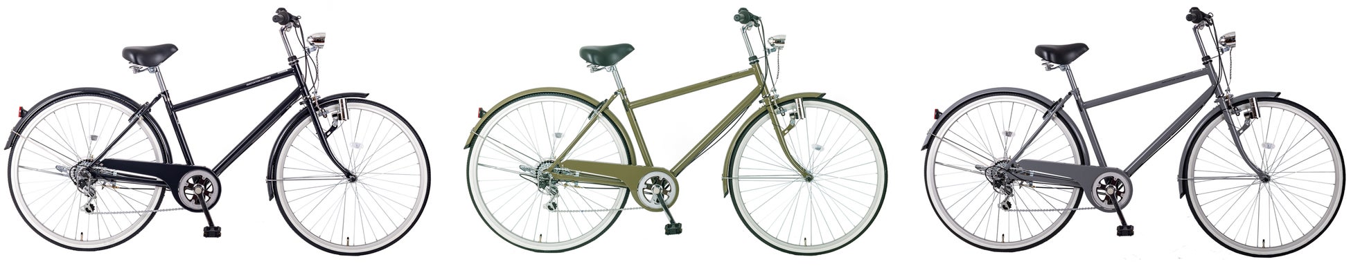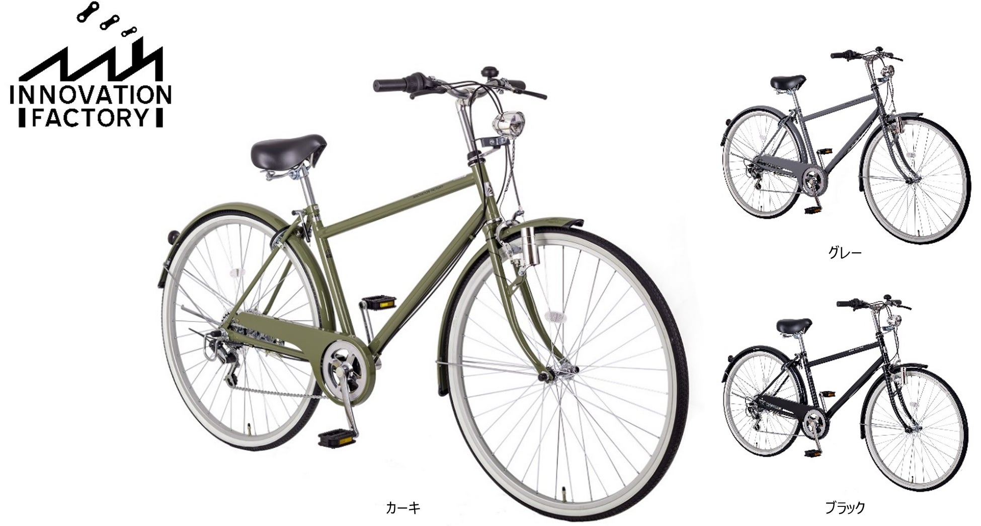 新発売の「イノベーションファクトリーシティS」は、背の高い男性にも乗車していただけるようフレーム寸法を調整し、直線的でシンプルなフレームに6段変速とストレートハンドルを採用。カラーはブラック、グレー、カーキの落ち着いたカラー展開で、幅広い層の方に選んでいただける自転車です。