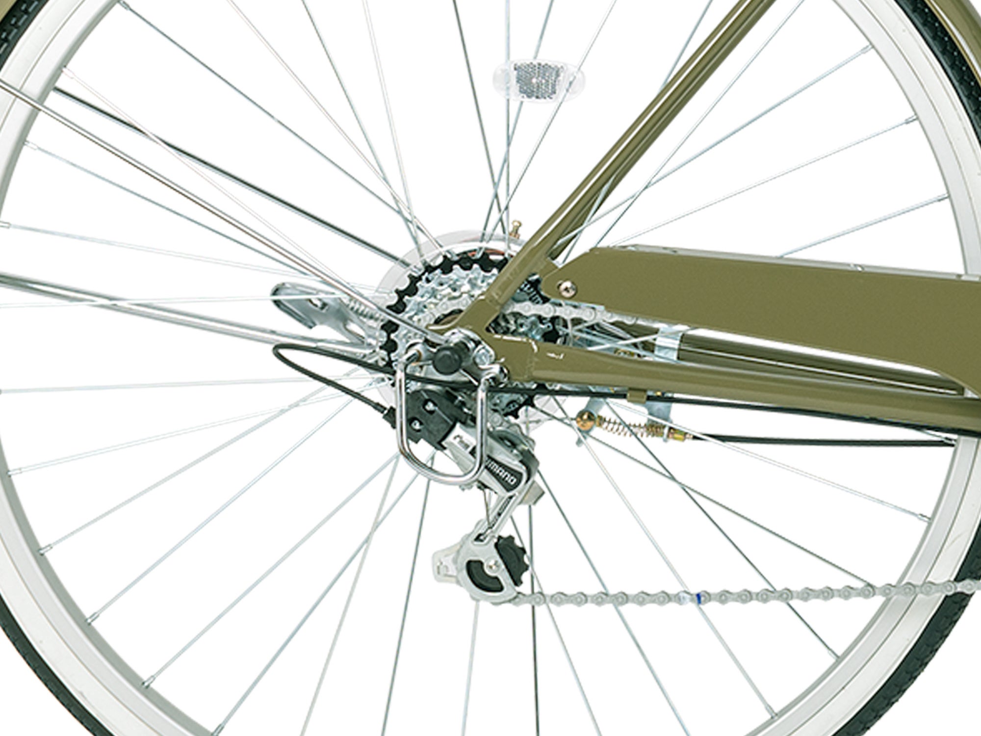 坂道や向かい風など、状況に応じて最適なギアを選べる外装6段変速仕様。坂道の多い地域や乗車距離が長い場合等に便利な装備です。