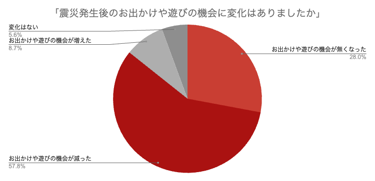 当社とカタリバが共同で実施した調査*によると、約9割の家庭が震災後に「外出・お出かけの機会が減った(なくなった)」と回答しました。現在の住居環境については、約6割が損壊ありの自宅に暮らし、約1割が避難所・仮設住宅で暮らしていると回答しました。