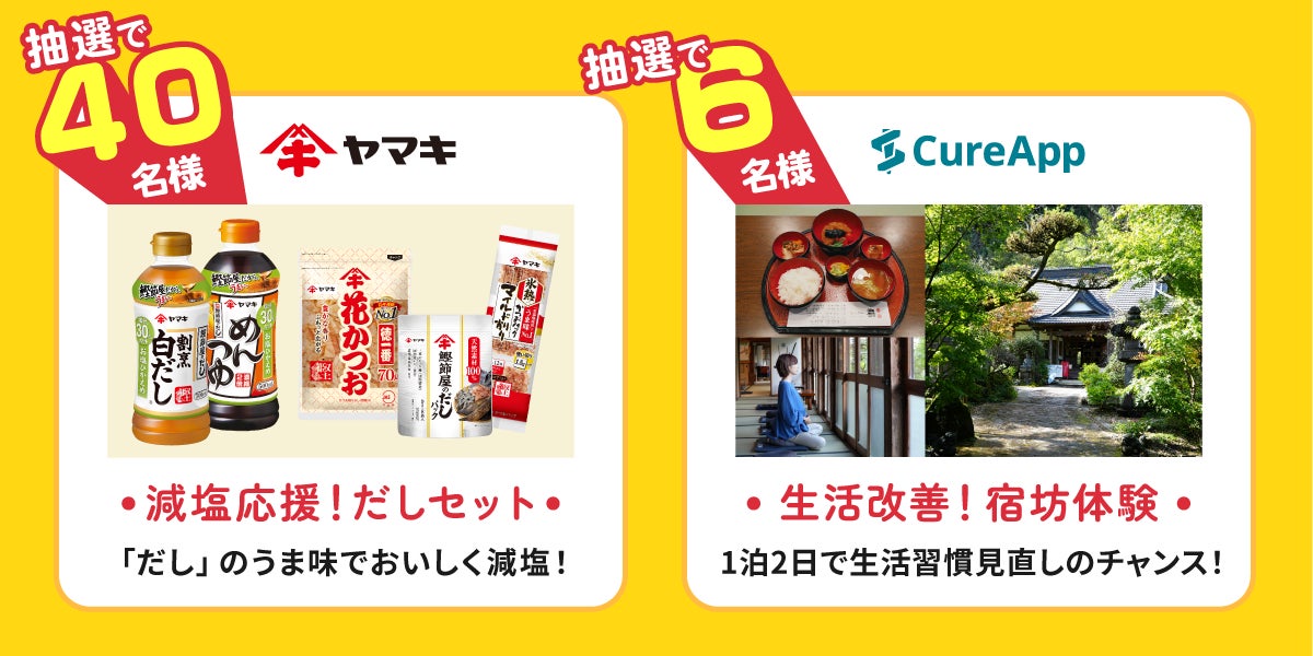 前回、昨年末にカゴメ株式会社と開催した「ナトカリバランス応援ウィーク」では2,000件を超えるご応募をいただきました。応募者アンケートでは「生活習慣を変えるきっかけとして定期的に開催してほしい」という要望を大変多くいただき、今回、ヤマキとのキャンペーン第2弾を開催する運びとなりました。今回のテーマは「“だし”で減塩 応援ウィーク」。生活習慣に関するアンケートにお答えいただき、抽選でヤマキが厳選した”だし”を活かして手軽においしく減塩ができる商品の詰め合わせや、生活習慣改善のきっかけをお届けする”宿坊体験”をプレゼントいたします。おいしく楽しみながら、日々の生活で、無理なく続けられる健康習慣を応援します。
