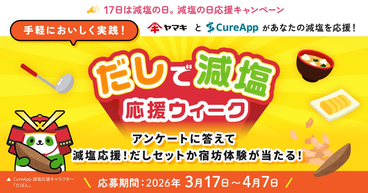 株式会社CureApp(キュア・アップ/本社:東京都中央区、代表取締役社長:佐竹晃太、以下「当社」)は、高血圧患者さん、および関係の方々に治療や生活習慣改善の大切さをお伝えするために、日本高血圧学会が提唱する「減塩の日」(毎月17日)に賛同し、本日3月17日(火)から3週間、「減塩の日 応援キャンペーン」を開催いたします。