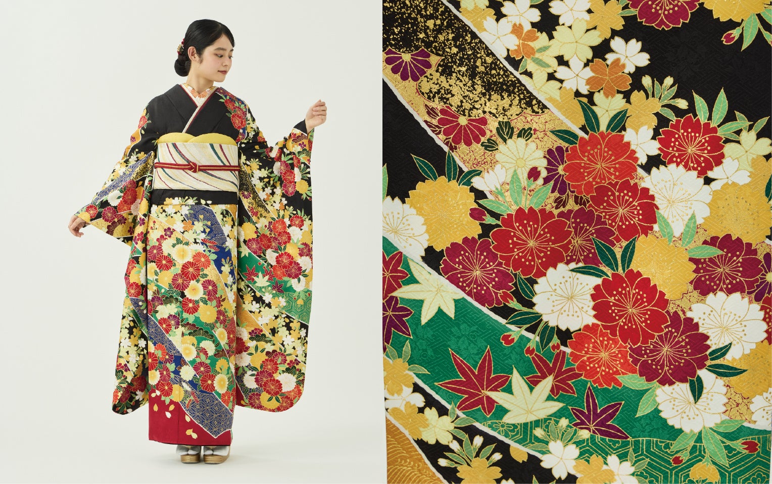 格式高く、絢爛豪華な振袖。菊・松・梅・橘などの吉祥文様を配し、黒の地色が色とりどりの花を鮮やかに引き立てます。帯はあえて控えめに、小物は柄の色を拾って統一感を演出しました。