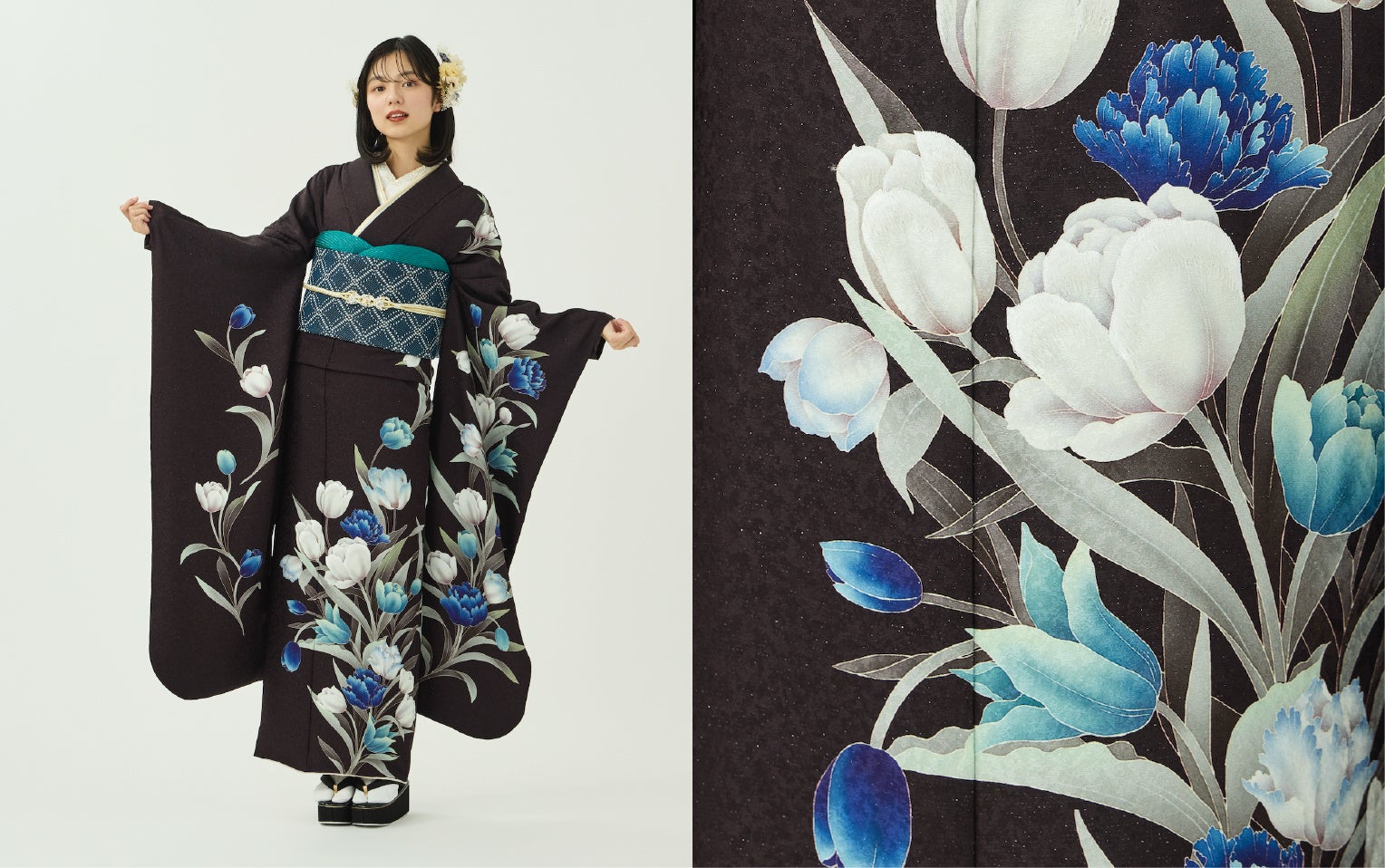 洗練された印象の振袖。咲き誇るチューリップが柔らかに揺れるように描かれ、可憐な表情を添えています。ビターブラウンの地色が花々を上品に引き立て、銀通しの生地で重さを感じさせない仕上がりに。帯と帯揚にはチューリップの色を取り入れ、統一感を持たせました。