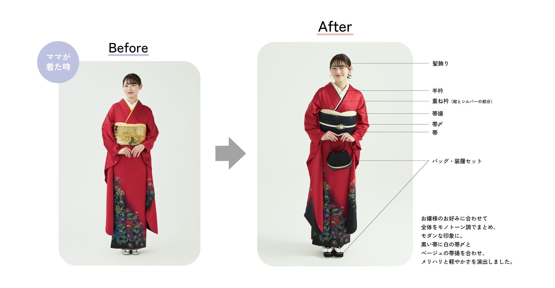 これまでのきものやまとオリジナル振袖を、お仕立上がりのレンタルとしてもご用意。お好みに合わせて、スタイリングの組み合わせも変更可能です。