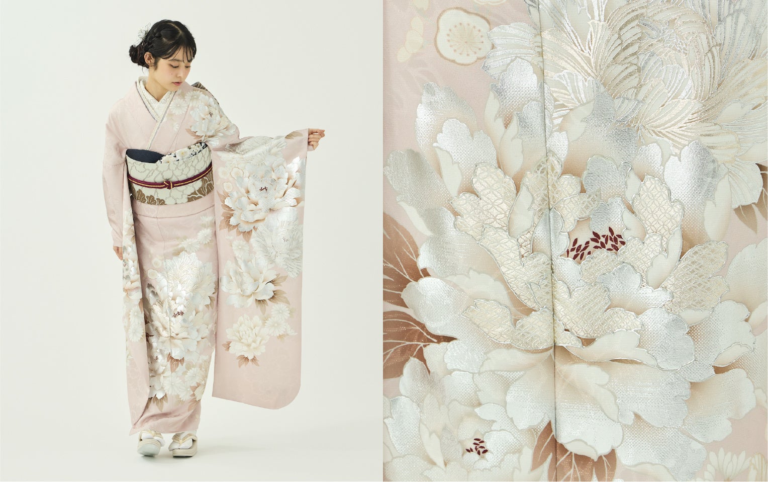 大輪の白い牡丹が上品で可憐な振袖。金の華やぎと銀の上品さを併せ持つプラチナ箔を用いることで、淡い桜色の地にほどよい華やぎを添えます。紺と紫の小物を合わせ、柔らかな中にも芯のある印象に。
