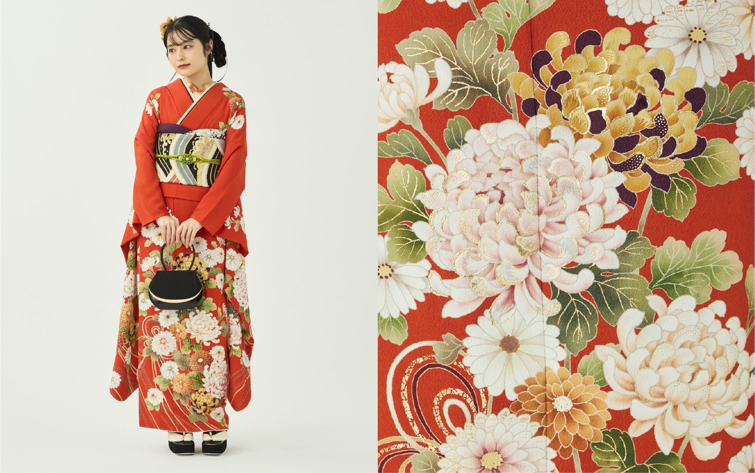 華やかで、クラシックな品の良さがただよう振袖。両肩に柄を配し、アンティークのような雰囲気に仕上げました。紅緋の地色が菊の白を引き立てます。格式を感じさせる正統派のコーディネートです。