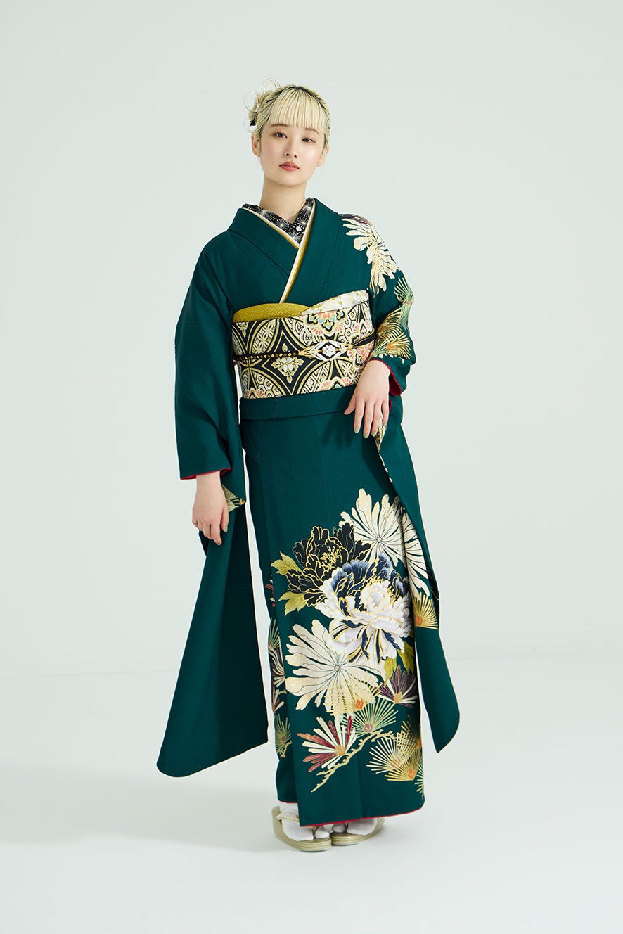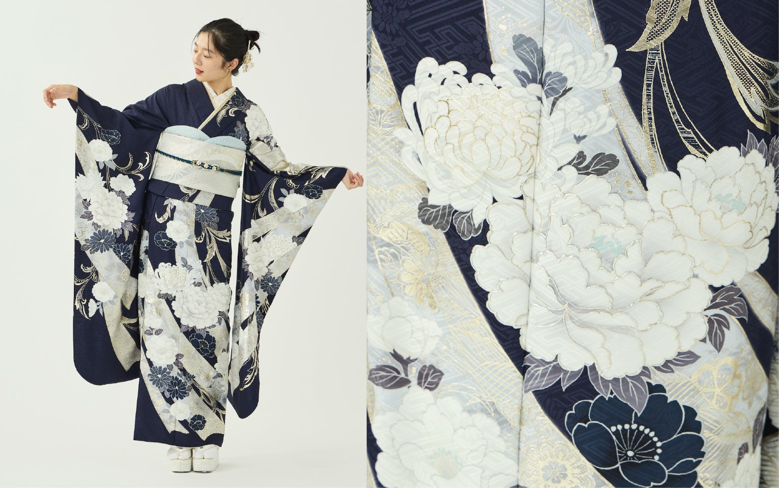 白い熨斗と牡丹に、プラチナ箔で品ある輝きを添えた振袖。深い紺の地色が柄の白を際立たせ、凛とした美しさを演出します。シルバーの帯と同系色の小物で、統一感のある装いに。
