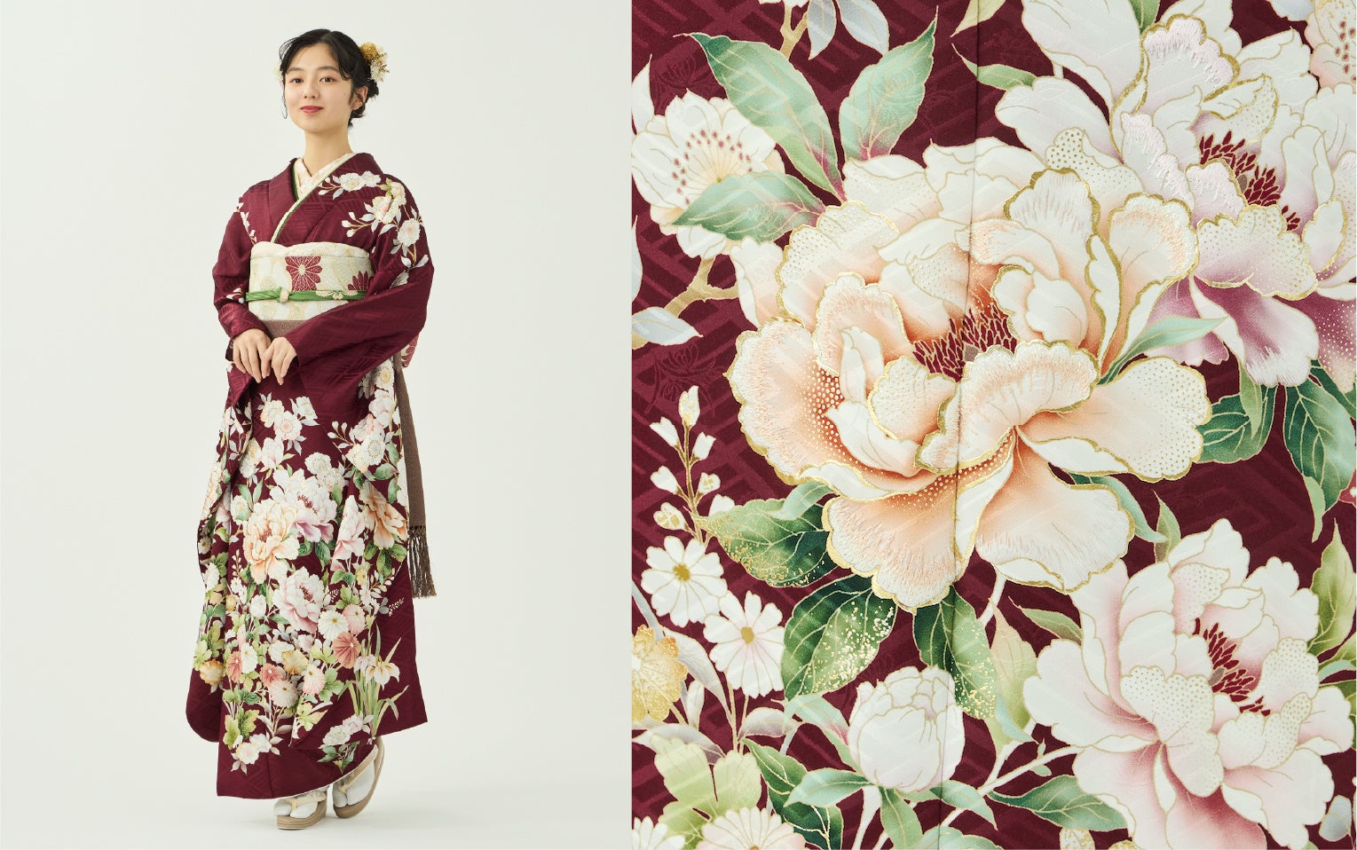 咲き誇る芍薬に誘われて舞う蝶を描いた、優美でしっとりとした雰囲気の振袖。両肩にあしらわれた柄が顔周りを華やかにしてくれます。臙脂の地色は柔らかさと落ち着きをあわせ持ち、柄の色味を小物に取り入れることでまとまりのあるコーディネートに。