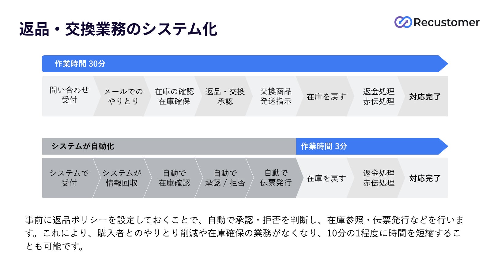 問い合わせの受付、メールなどでのやり取り、在庫の確認・確保、返品・交換の承認、交換商品の発送指示などの業務を全て自動化。これまで30分ほどかかっていた作業時間を、3分ほどに短縮できます。