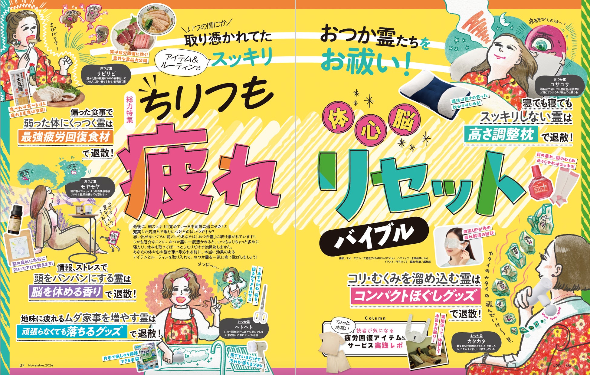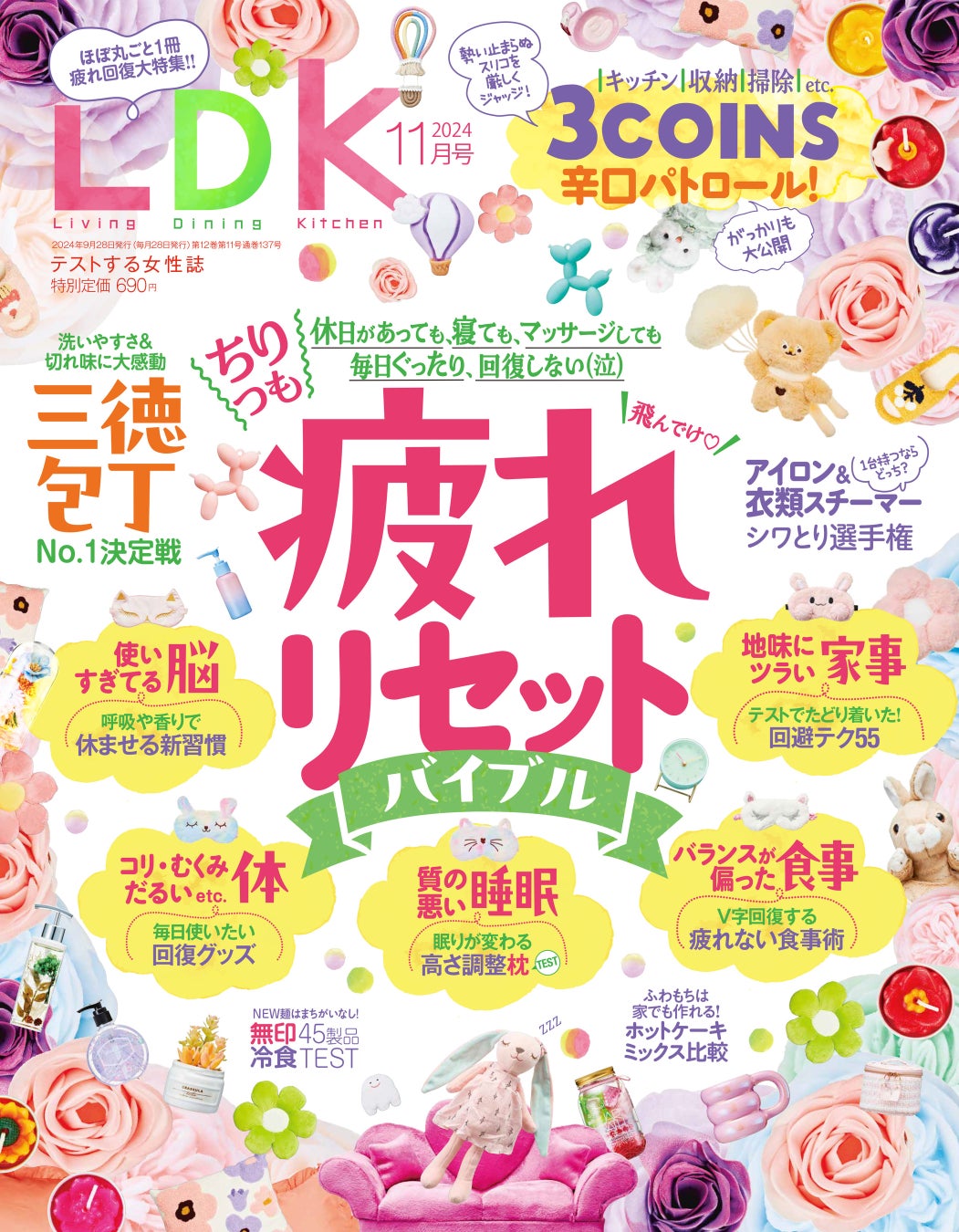 11月号は「ちりつも疲れリセットバイブル」を総力特集! 休んでも・寝ても・マッサージしても、何だかスッキリせず、毎日グッタリしていませんか? しつこい疲れをリセットするマッサージアイテムや寝具、ワザをたっぷり掲載。また、三徳包丁のベストや無印良品の冷凍食品の実食テスト、3COINSアイテムのアリナシ判定など、気になるアノ店での買い物に役立つ情報も集めました。