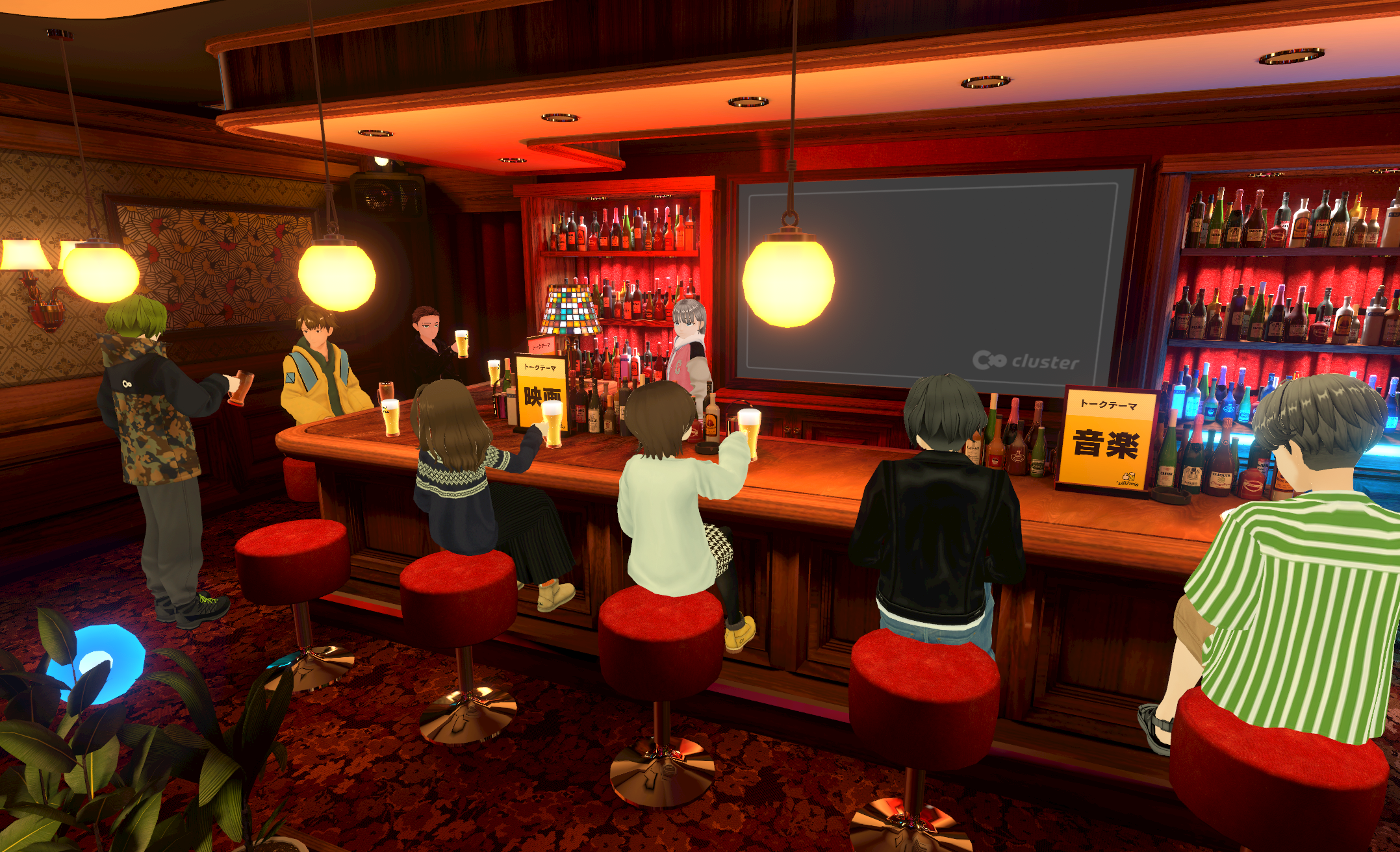 ・バーチャル空間の飲食店オーナーとユーザーや、ユーザー同士のコミュニケーションの機会を創出し、『THE DRAFTERS(ドラフターズ)』の体験価値である「“本当にうまい生ビール”を、いつでもどこでも楽しめる世界を創る」の充実を図ります。実際のスナック空間のように狭い空間をあえて再現しています。これまでのclusterのユーザーの多くに好まれる「オンラインコミュニケーション」の楽しさを感じられる空間作りの知見を活かした世界観になっています。