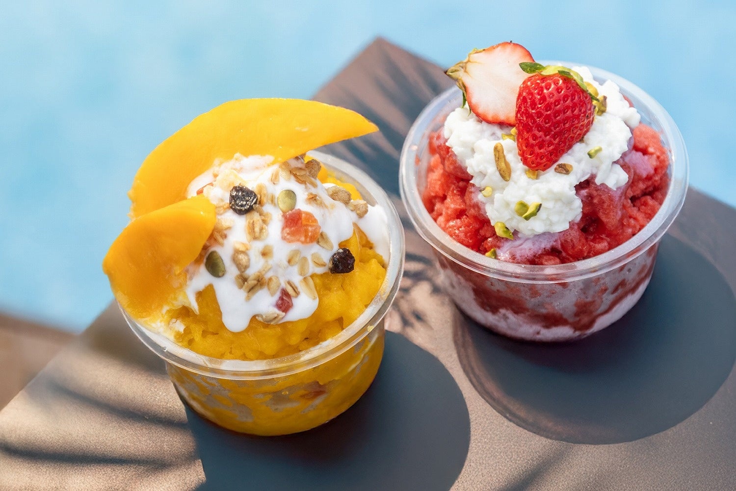 味も見た目も贅沢なかき氷!いちご、マンゴーの2種をご用意しました。いちごとマンゴーをピューレにし、そのまま凍らせた新感覚かき氷をぜひご堪能ください。