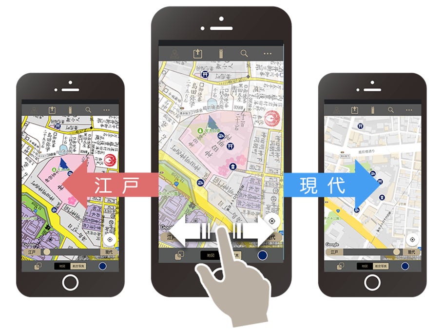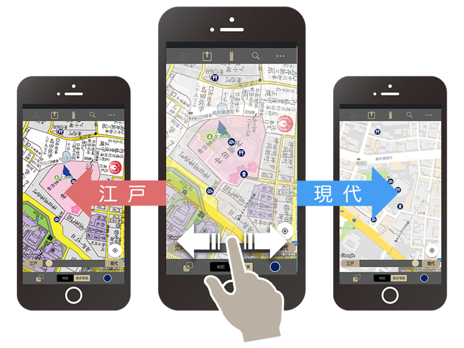 本アプリは「完全描き起こし」により、正縮尺で再現した江戸末期の古地図と現代の地図を、スマートフォンや、タブレットの画面上で容易に重ね合わせて楽しむことができるアプリです。現在地情報とも連動し、東京の町を歩きながら、現地の江戸時代の様子を、瞬時にスマホ上で確認することができることから、歴史好き、地図好きの方はもちろん、街歩きを愛好する皆さまにも、ご支持をいただいております。