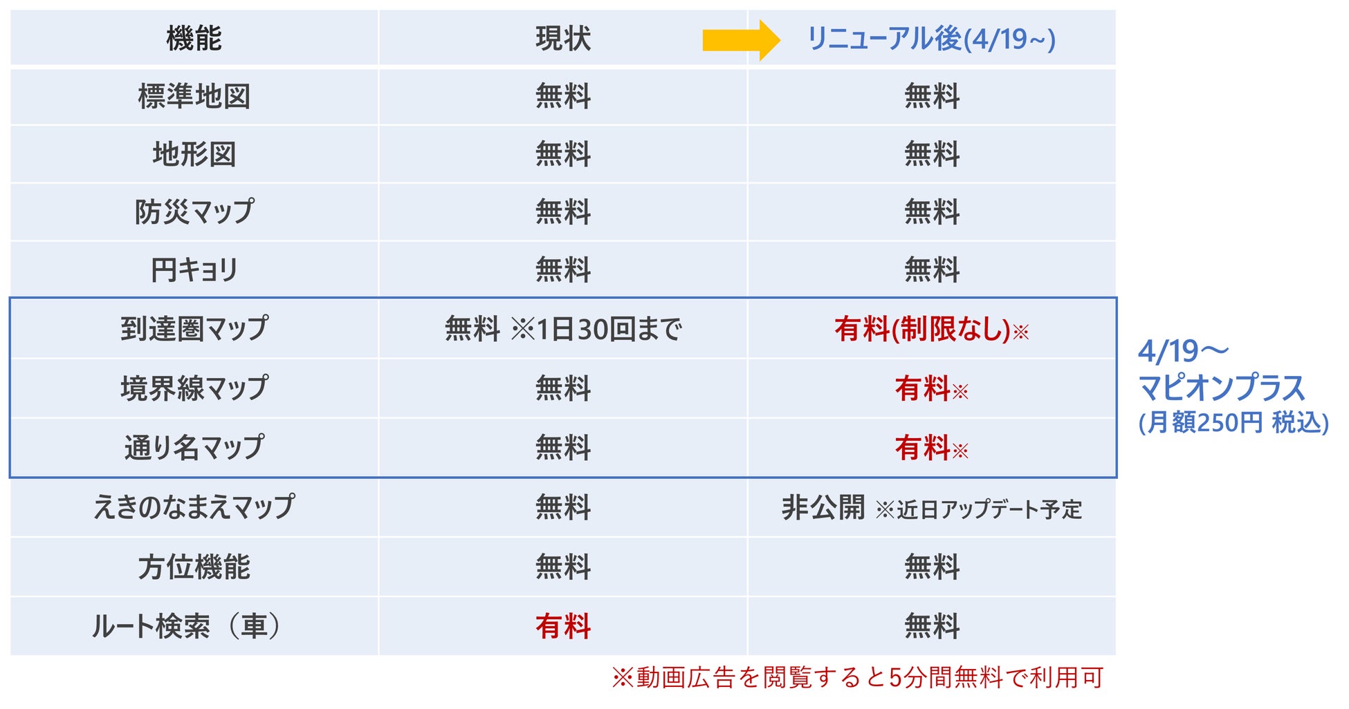 サブスクリプション型の有料サービスの名称を、このたび「マピオンプラス」としました。対象サービスは、市区町村などの境界線がはっきりと見える「境界線マップ」、道路の名前を分かりやすく見られる「通り名マップ」、指定時間内にどこまで到達できるかを検索できる「到達圏マップ」の3種類で、月額250円(税込)で提供します。なお、これらの地図は動画広告を閲覧することで、5分間無料で使うことができます。また、これ以外の「地形図」「円キョリ」「防災マップ」などはこれまで通り無料での提供となります。