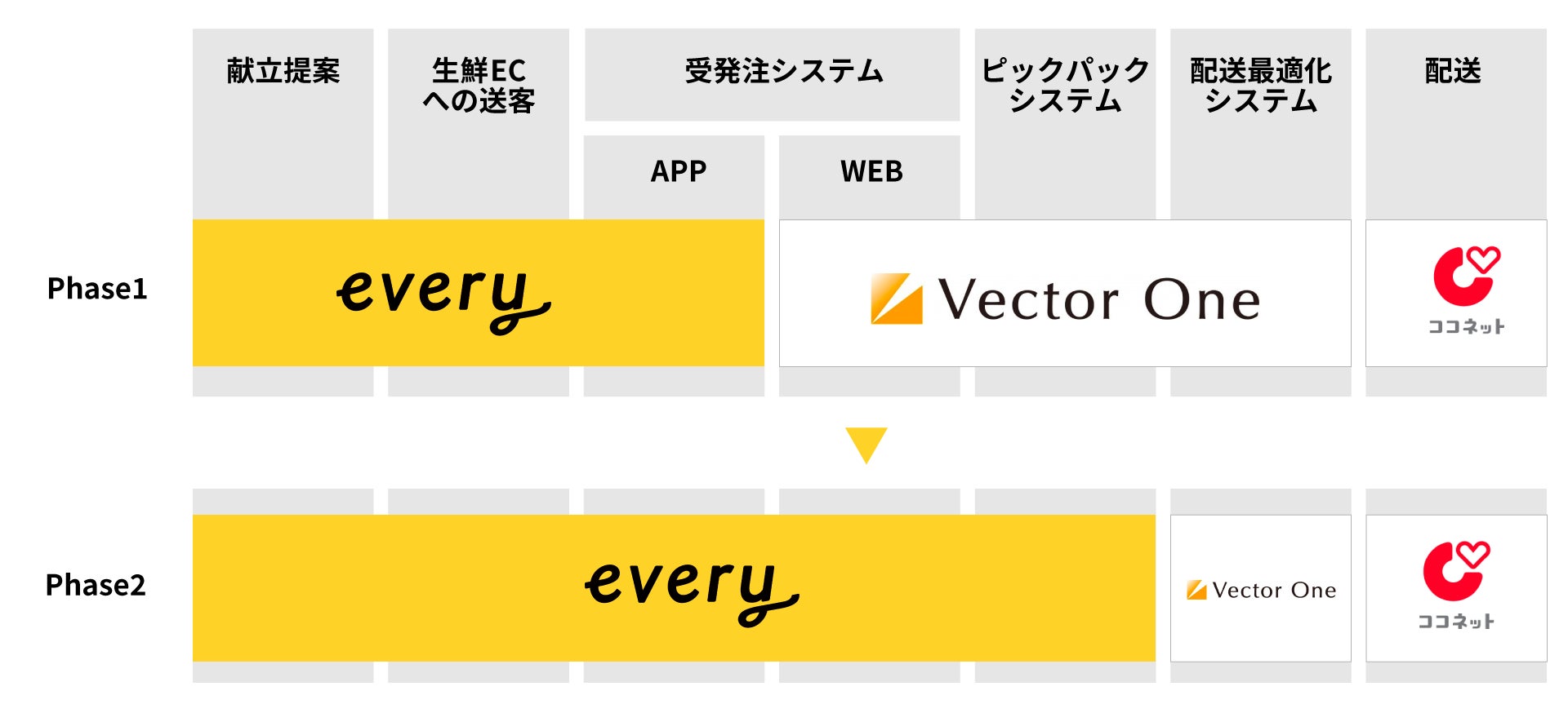 同時に、ベクトルワンが保有するネットスーパーの受注システムとピックパック支援システムについては、マーケティング・CRM機能を強化することを目的としてエブリーに譲渡することで、ニーズが高まるラストワンマイルDXソリューションにリソースの最適化を図ります。