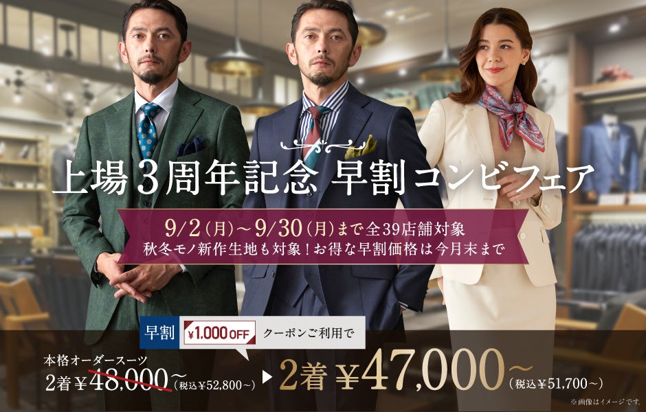 【枚方モール】オーダースーツ専門店 グローバルスタイルが、枚方モール 2Fに新店舗をオープン!9/30(月)まで「上場3周年記念フェア」を全39店舗で開催!