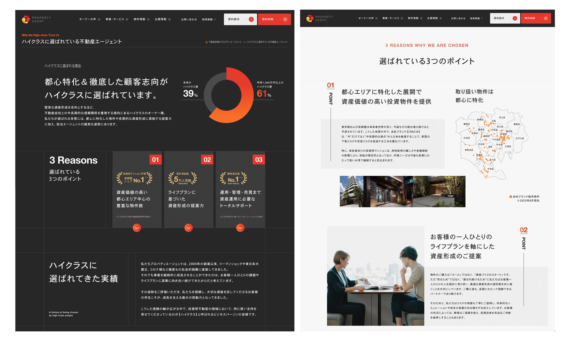 当社は、多くのハイクラスの皆さまに支えられ、創業以来21期連続で増収を達成いたしました。日々忙しくビジネスに励み、「長期的な信頼関係を重視し、安心して任せられるパートナーを選ぶ」という価値観を持つハイクラス層に、なぜ選ばれ続けてきたのか?その理由を紐解くコーポレートサイトとなっております。
