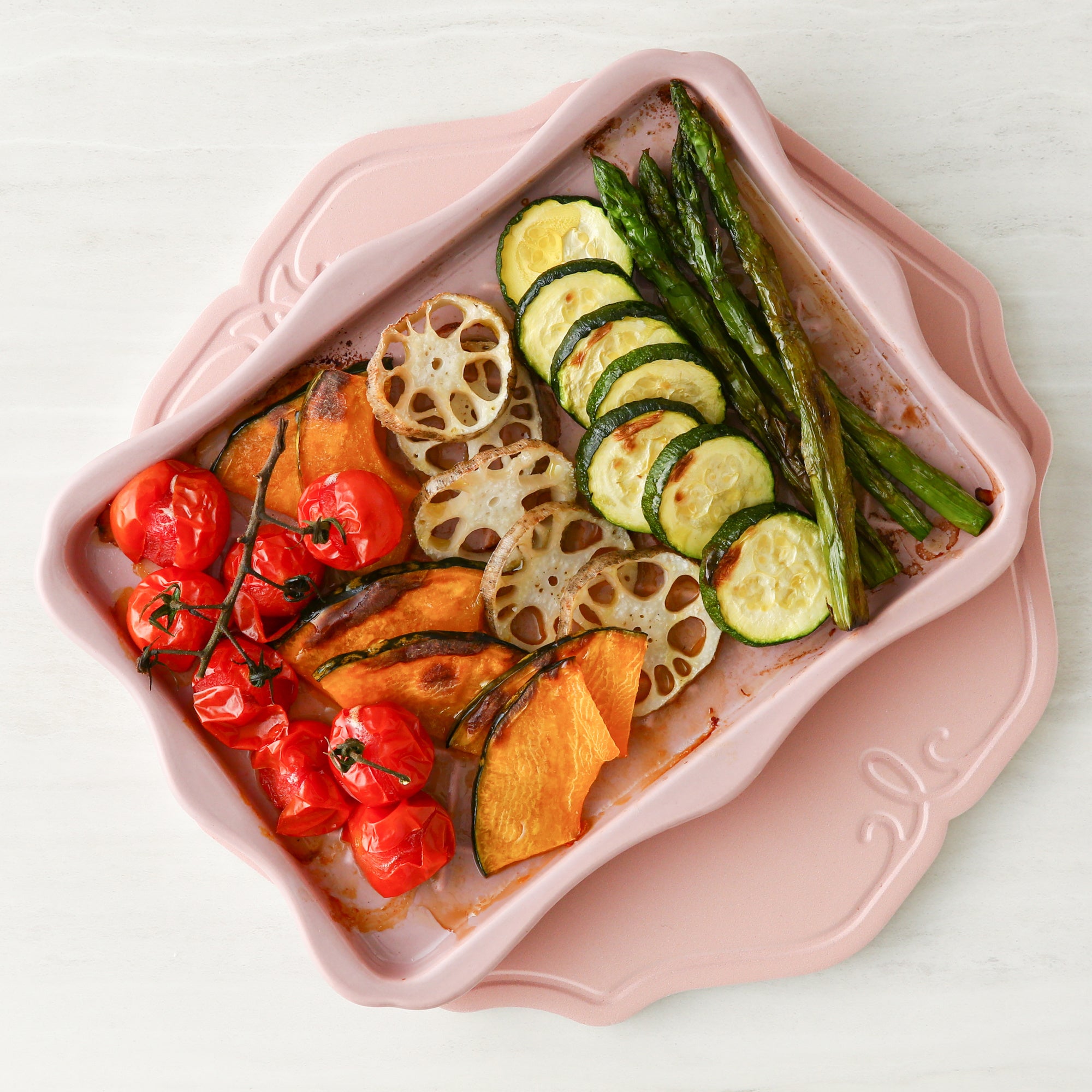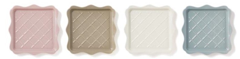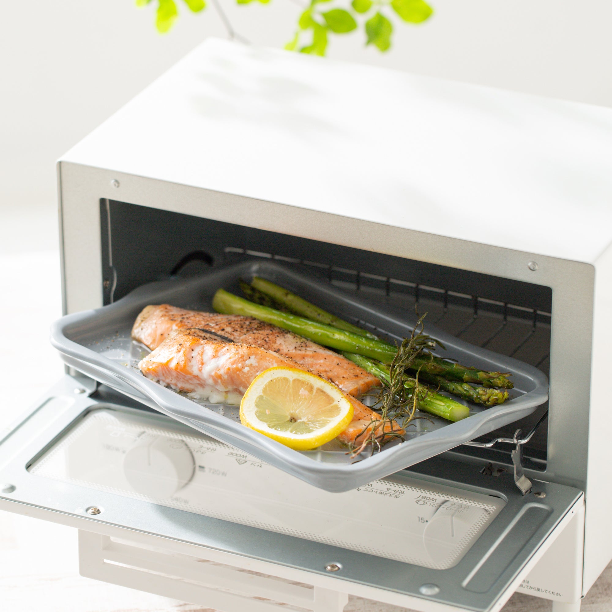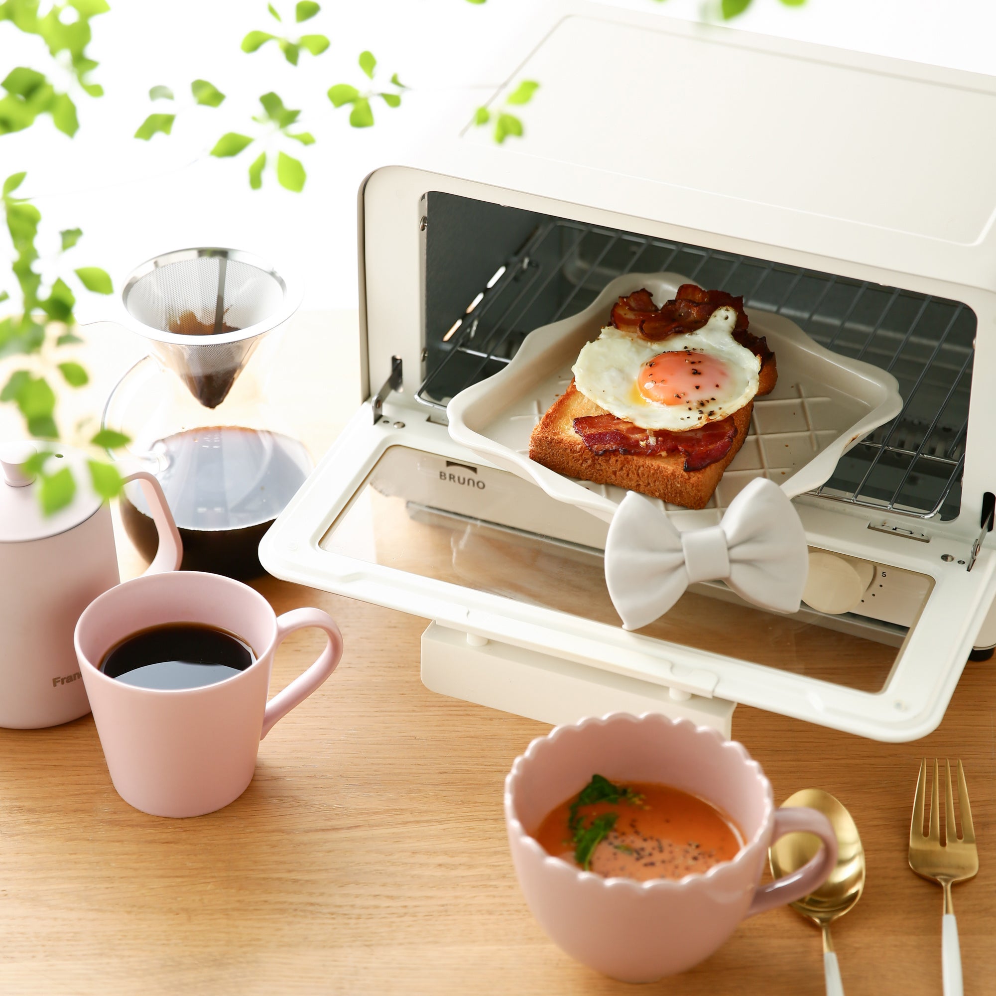 くすみカラーとフリルの形状がかわいい、食材をのせてそのままオーブントースターで調理ができるプレートです。大き目のサイズなのでちょっとしたおかずを作ることもできます。凹凸を活かして天ぷらなどの、サクサクと食べたい料理をのせるのもおすすめです。オーブン使用可能なので、具沢山トーストをプレート上で作成し、そのまま焼くこともできます。こぼれたチーズなどもエンボスのおかげではがれやすく、お手入れしやすいのも嬉しいポイントです。