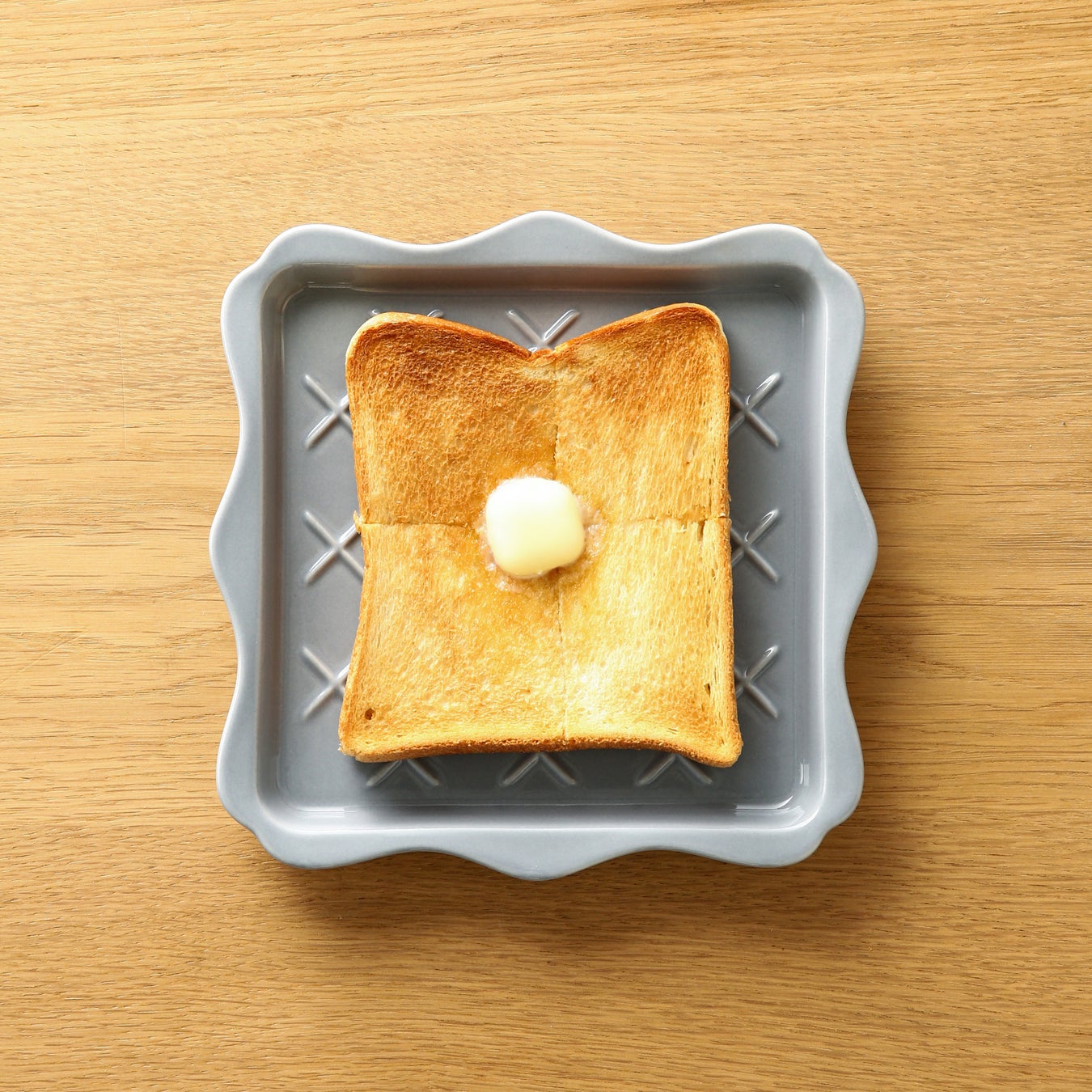 くすみカラーとフリルの形状がかわいい、食パンが一枚のる大きさが人気のトーストプレートです。