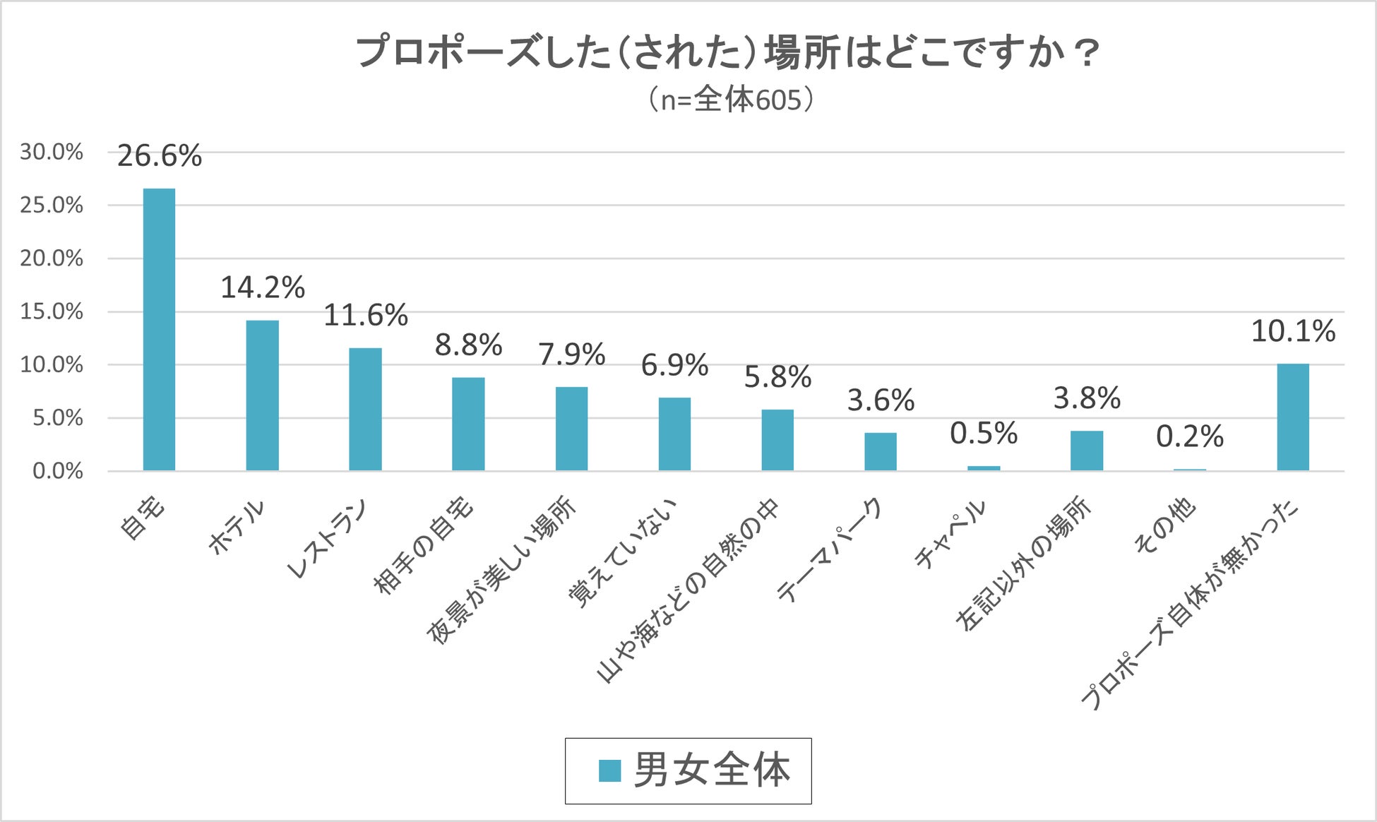 最初の設問では既婚男女605人に、「プロポーズをした(された)場所」がどこだったかについて質問をしました。(※この設問への回答結果が男女ともにどの選択肢もほぼ同じ割合であったことから男女全体として結果をグラフにまとめました。)