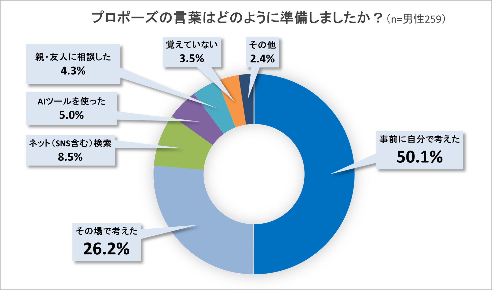 この設問では、前の設問で「プロポーズ自体がなかった」、「覚えていない」、「その他」の3つの選択肢以外の回答を選択した男性259名に対して、「プロポーズの言葉はどのように準備しましたか?」という質問をしました。