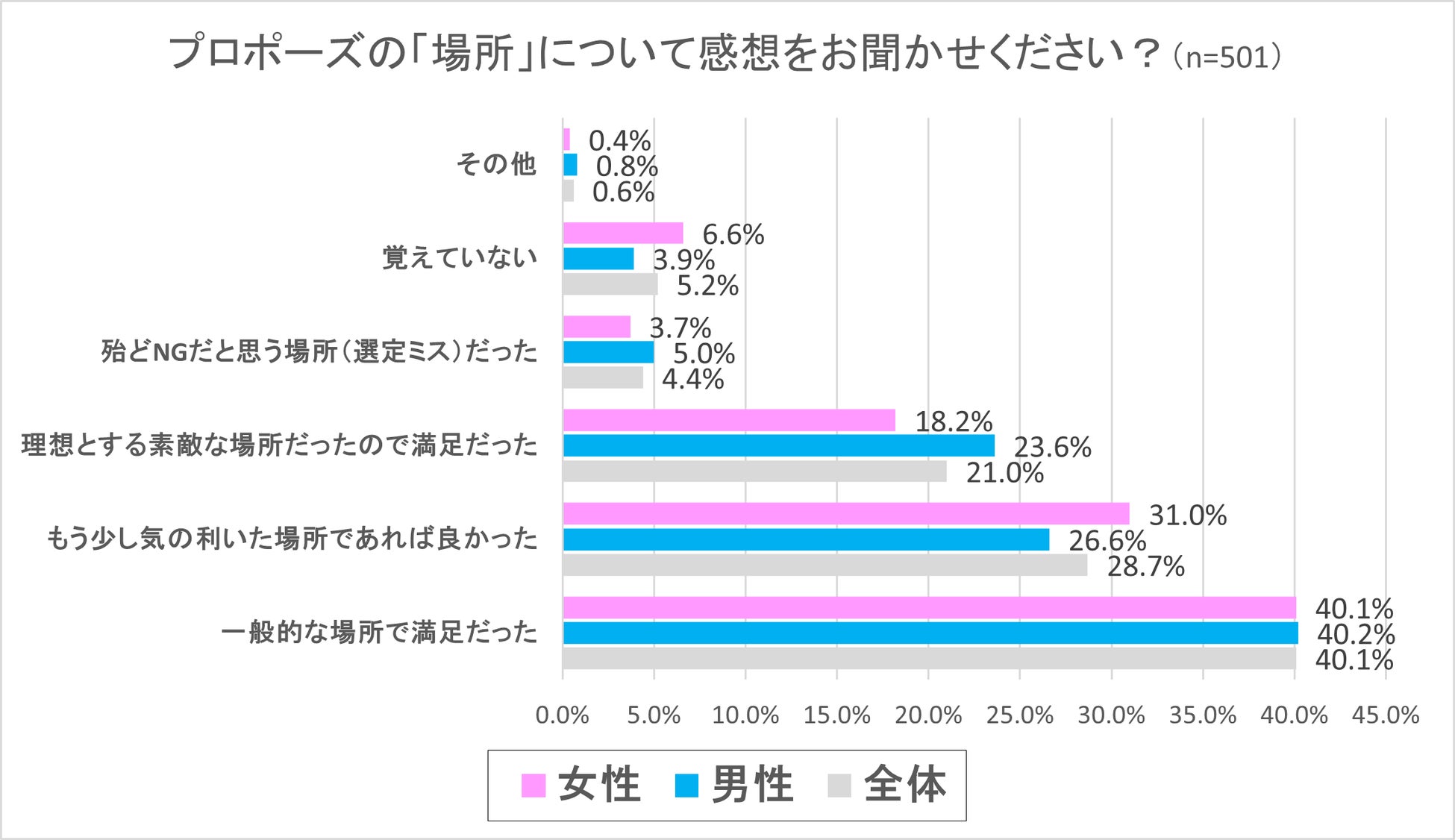 この設問では調査対象のうち、プロポーズをした(された)男女501人に対して、プロポーズした(された)場所について感想をうかがってみました。