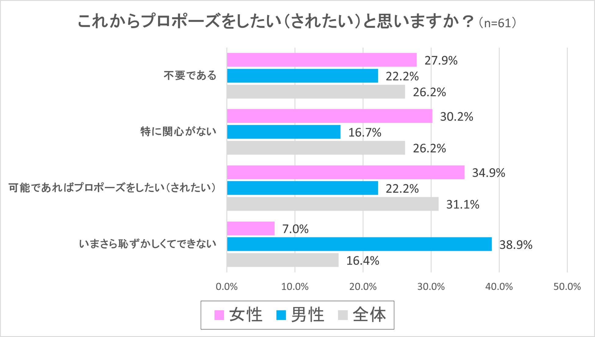 この設問では前出の設問で「プロポーズ自体がなかった」と回答した今回の調査対象全体の約1割にあたる男女61人に、「これからプロポーズをしたい(されたい)と思いますか?」という質問をしてみました。