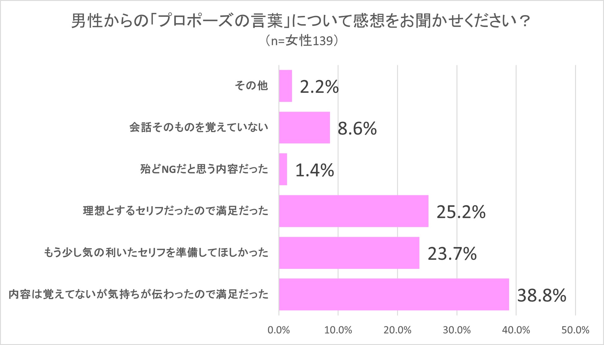 この設問ではアンケート対象者のうち、プロポーズをされた女性139人に対して男性からの「プロポーズの言葉」について感想を質問しました。