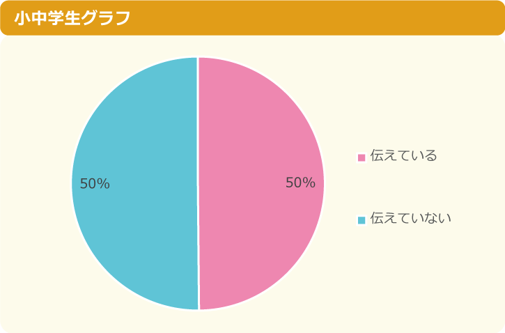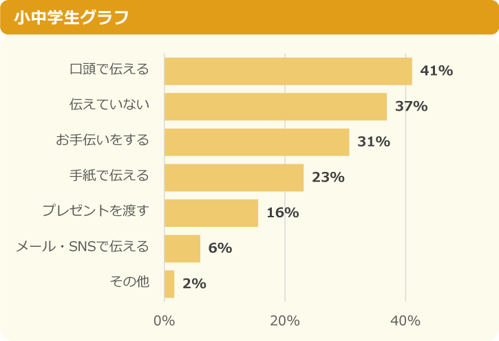 日頃からおうちの人への感謝を伝えているかという質問には、「口頭で伝える」と回答した小中学生は41%で「伝えていない」と答えた人は37%でした。感謝を伝えている人の中には「口頭で伝える」以外に「お手伝いをする」「手紙で伝える」「プレゼントを渡す」など、面と向かって言わずに別の方法で表している人もいました。