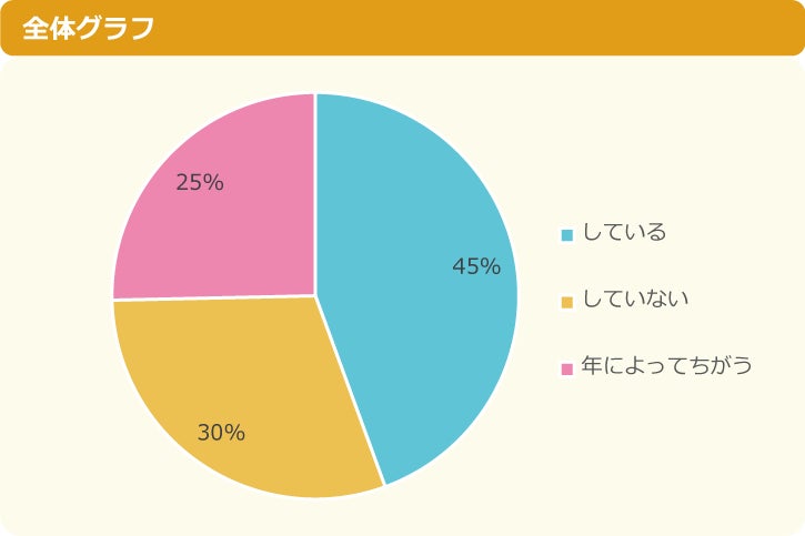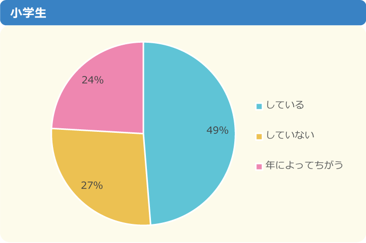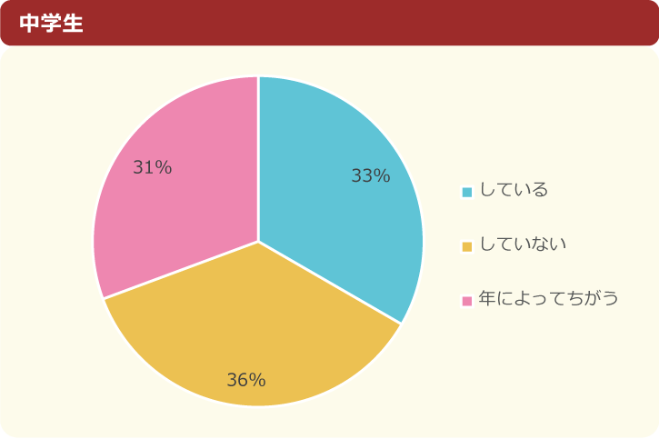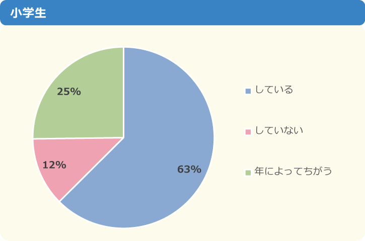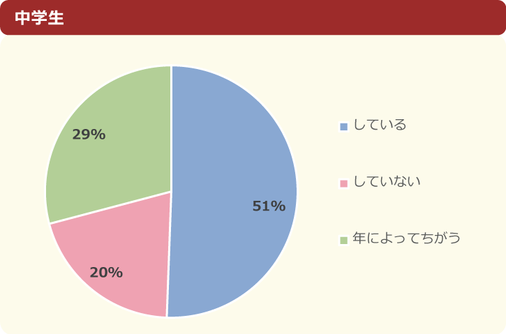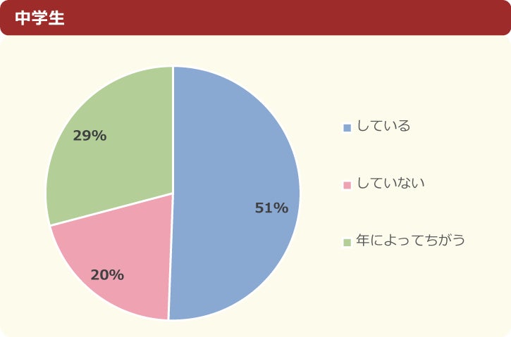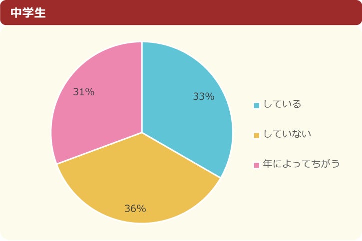 父の日に何か「している」人は小学生は49%、中学生は33%でした。中学生では「している」人より「していない」人の方が多いことがわかりました。母の日は、何か「している」と回答した小学生が63%で中学生は51%だったので、父の日より母の日の方が何か「している」人が全体的に多いようです。