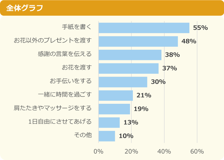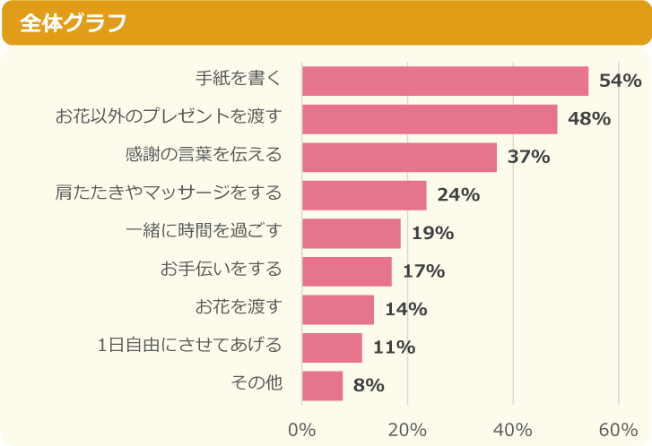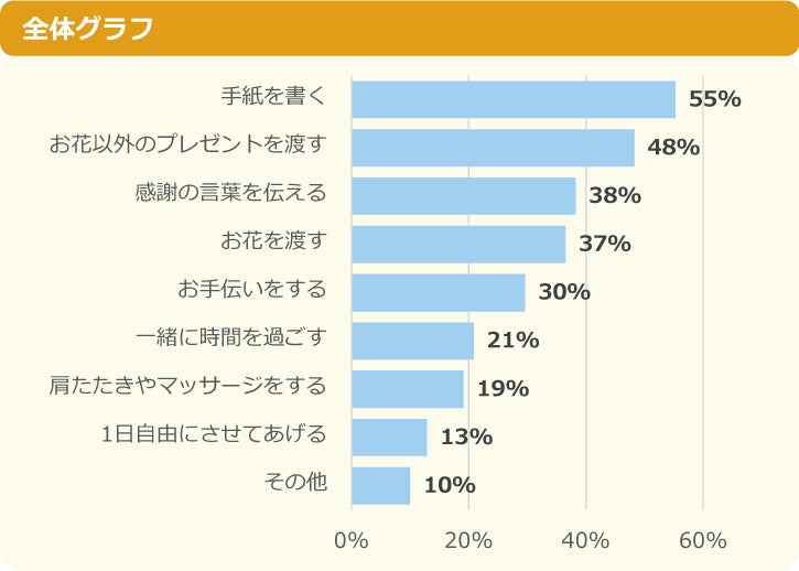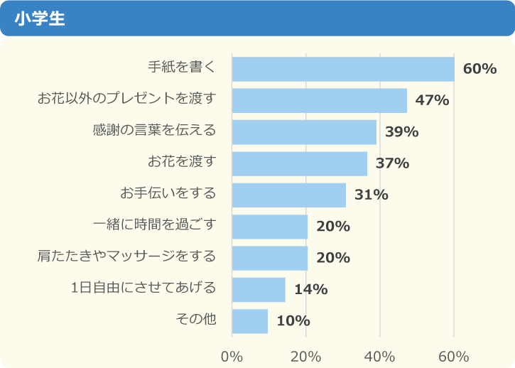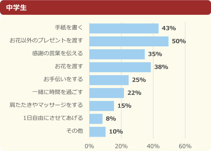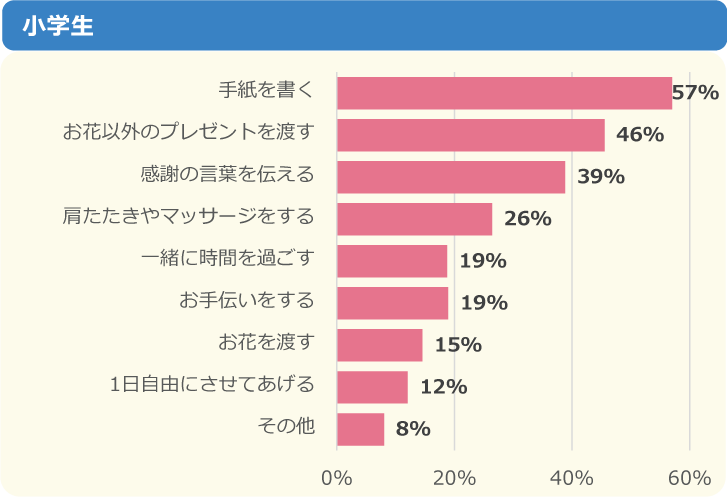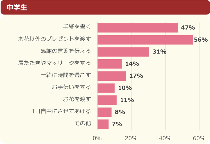 小学生では「手紙を書く」、中学生では「お花以外のプレゼントを渡す」が最多でした。中学生になると自分のお小遣いでプレゼントを買えるようになる人が増えるのかもしれません。