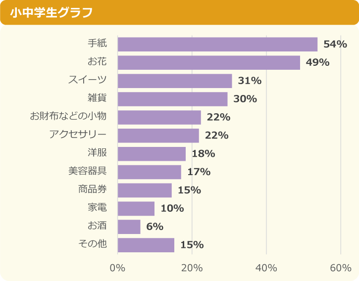 小中学生の回答の上位は「手紙」、「お花」でした。