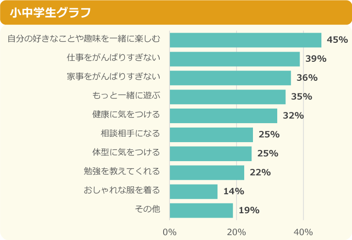 「自分の好きなことや趣味を一緒に楽しむ」が45%で1位でした。仕事や家事を「がんばりすぎない」でほしいという意見の他に、「健康に気をつける」が5位に入っていることから、おうちの人のことを気づかっている様子が伝わります。