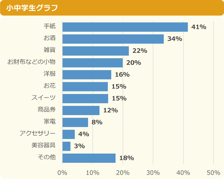 小中学生の回答の上位は「手紙」、「お酒」でした。