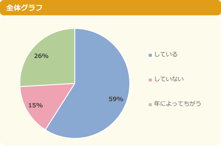母の日に何か「している」と答えた人は、全体の59%で小学生の方が中学生よりも多いようです。「年によってちがう」も合わせると、何かしたことがある人は全体で85%いることがわかりました。