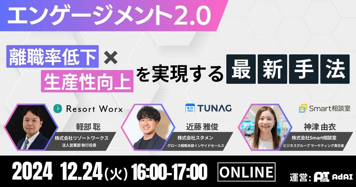 従業員エンゲージメントを高めるクラウドサービス「TUNAG(ツナグ、https://biz.tunag.jp/ )」を提供する株式会社スタメン(東京本社:東京都千代田区、代表取締役:大西 泰平)は、株式会社リゾートワークス(本社:沖縄県那覇市、代表取締役:柳田 将司)、株式会社Smart相談室(本社:東京都港区、代表取締役・CEO:藤田 康男)は、2024年12月24日(火) 16:00〜17:00に参加無料の共催ウェビナーを開催いたします。