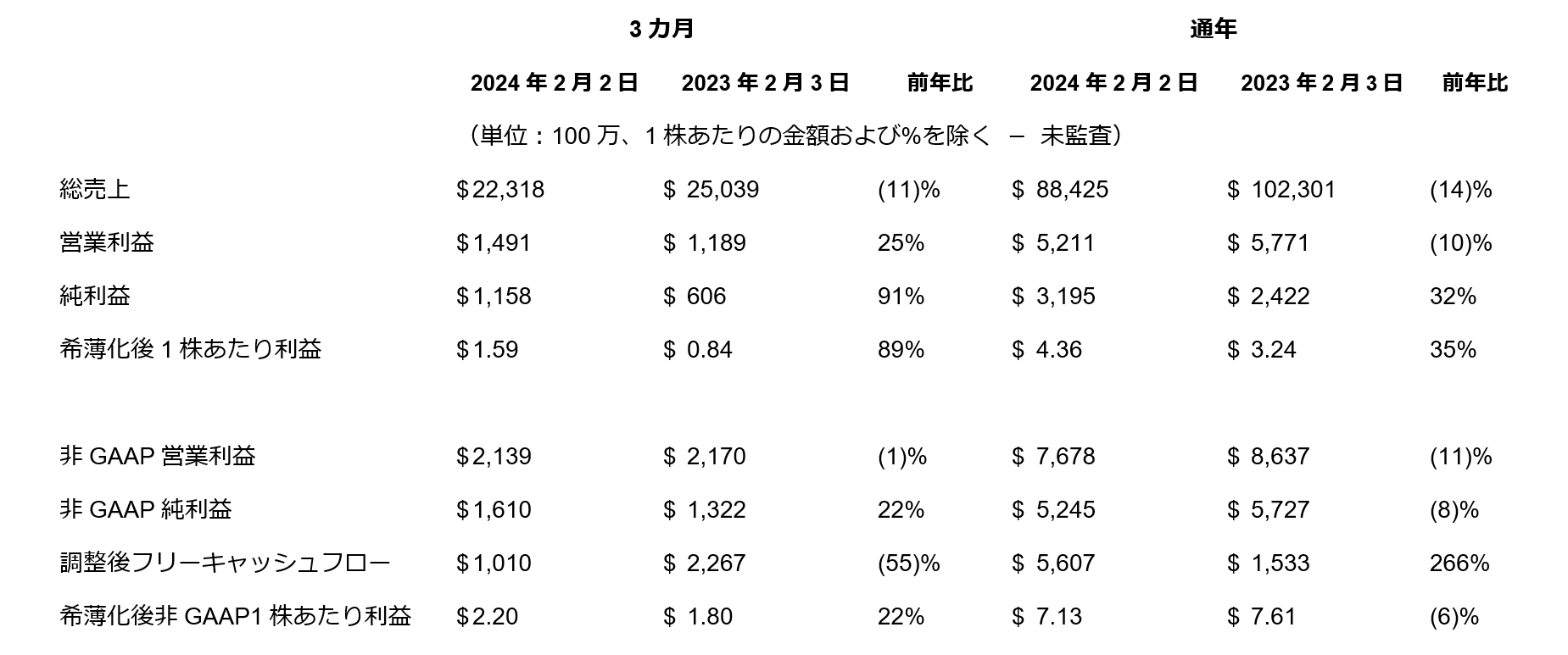 通年の売上高は、前年比14%減の884億ドルでした。営業利益は前年比10%減の52億ドル、非GAAPベースの営業利益は前年比11%減の77億ドルでした。営業キャッシュフローは87億ドルでした。希薄化後1株あたり利益は前年比35%増の4.36ドル、非GAAPベースの希薄化後1株あたり利益は前年比6%減の7.13ドルでした。