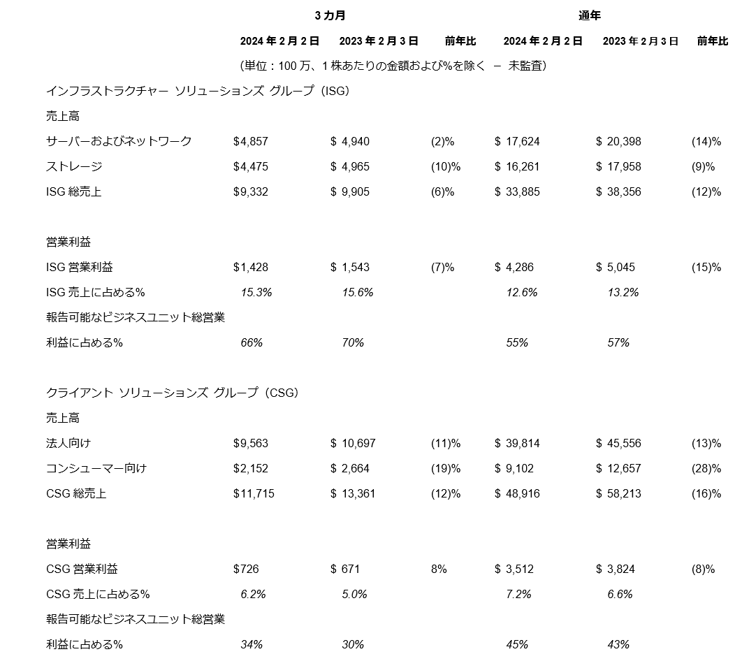 クライアント ソリューションズ グループ(以下、CSG)の第4四半期の売上高は、前期比5%減、前年同期比12%減の117億ドルでした。法人向けPCの売上高は96億ドル、コンシューマー向けの売上高は22億ドルで、営業利益は7億2,600万ドルでした。CSGの通年の売上高は、前年比16%減の489億ドル、営業利益は前年比8%減の35億ドルでした。