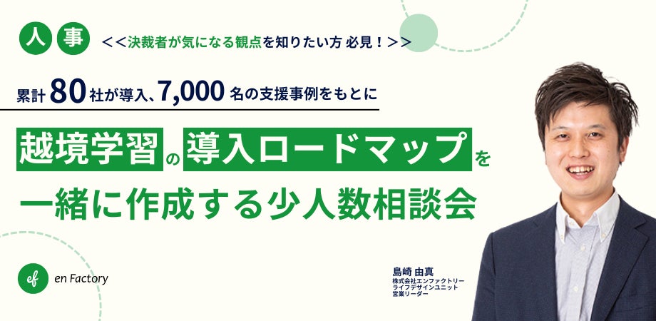 そこで、参加しやすい・させやすいラインナップから「はじめての越境学習導入」に強みを持ち、累計250社7,000名以上の越境学習支援を行ってきた株式会社エンファクトリーの島崎が、これらの不安にお答えしながら、越境学習の導入ロードマップを一緒に作成する少人数相談会を開催します。