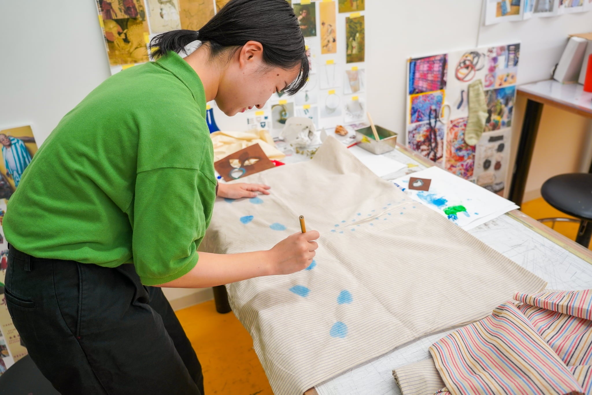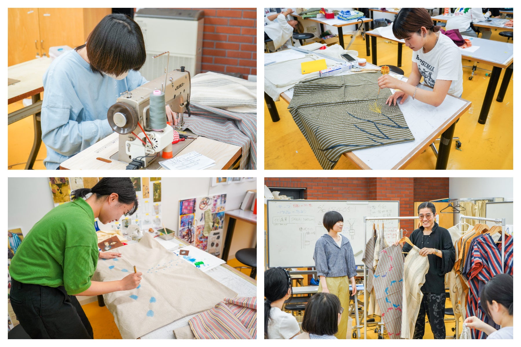 SOU・SOUから提供された15種類の柄から生地を選び、学生がそれぞれ絵を描いたり、染色、刺繍したりと装飾を考え、個性が光る貫頭衣に仕上げました。また、店頭販売の運営はもちろん、オンラインショップの立ち上げや運営、SNS発信(https://www.instagram.com/sou.sou.kua)も学生自ら手掛けています。