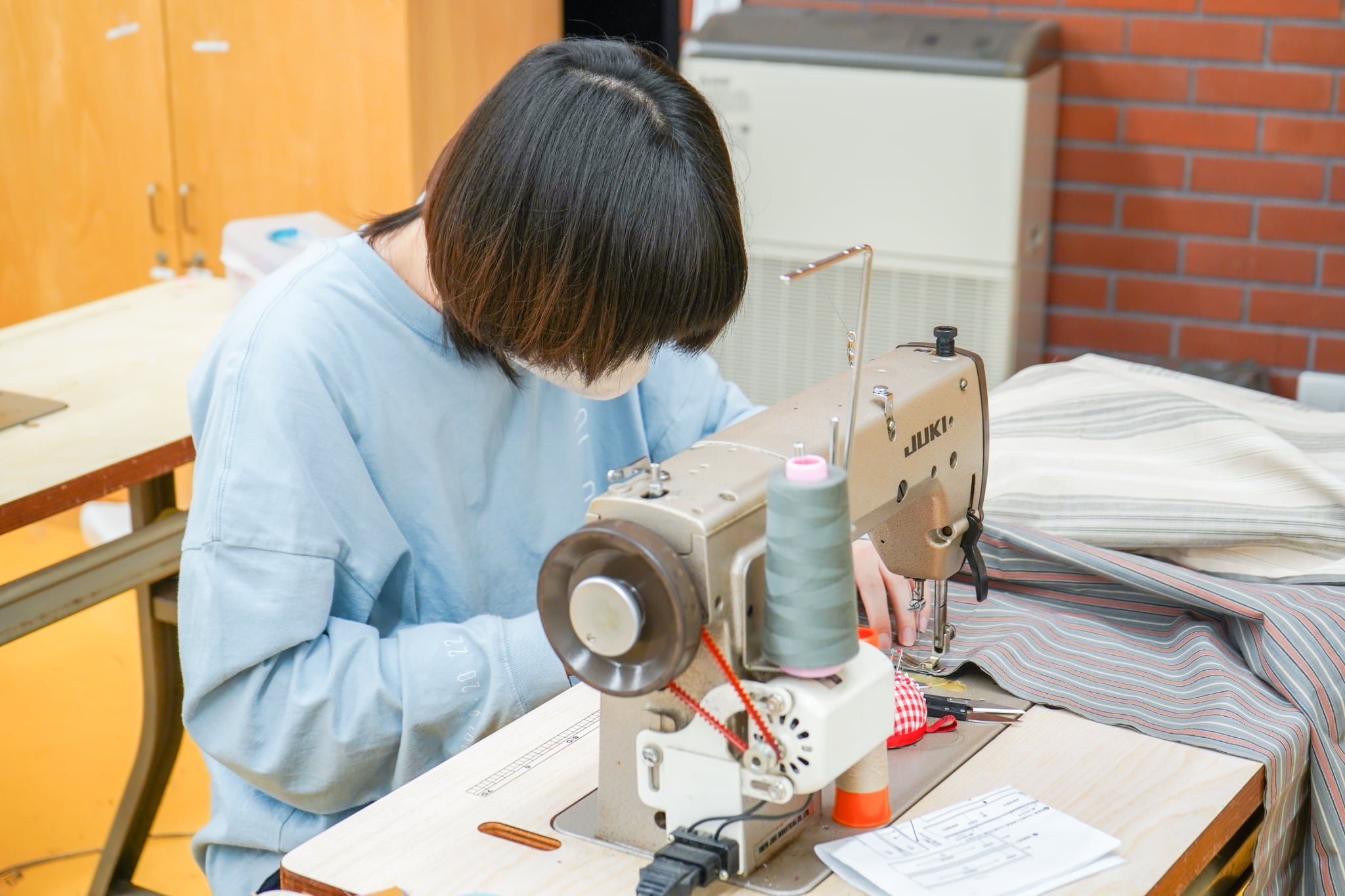 人気テキスタイルブランドSOU・SOU(京都市中京区)代表で本学の准教授の若林剛之と本学専任講師の伊藤正浩の指導のもと、貫頭衣という日本古来の衣装を現代デザインとして制作、販売まで行っています。生地には伝統工芸品である伊勢木綿を使用しており、ファッションを通して日本の文化や伝統産業の価値をお客様にお伝えし、それらを残していく方法を学生が自ら模索しました。商品は毎年完売と人気を博しています。
