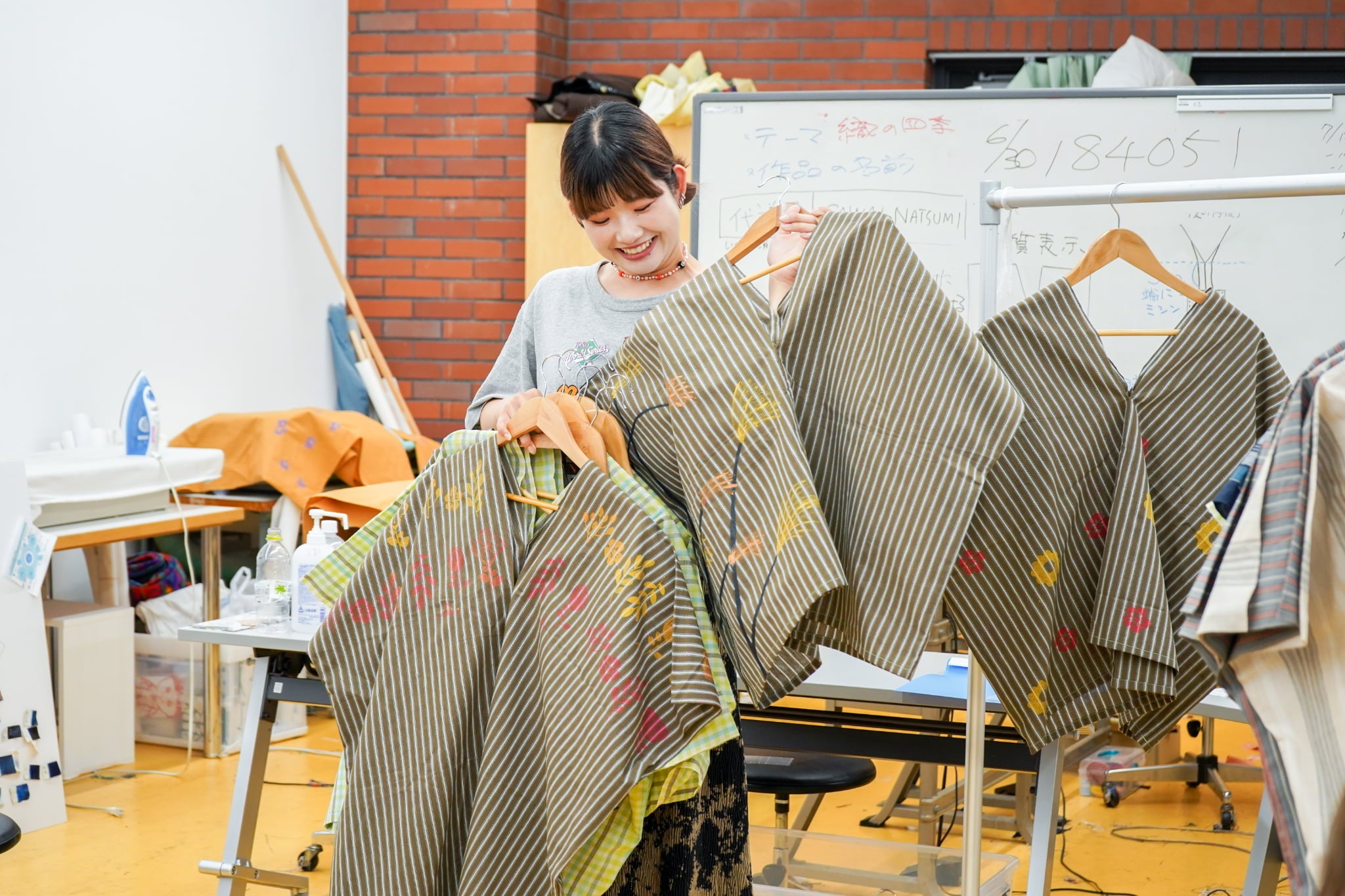 季節を着る。四季を大切にするSOU・SOU、手ぬぐいで季節の移ろいを感じるとともに、伊勢木綿という織物に「四季」と「京都」を感じられるようなものを。学生1人1人の考える「四季」が詰まった、十人十色な貫頭衣。