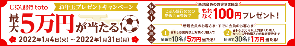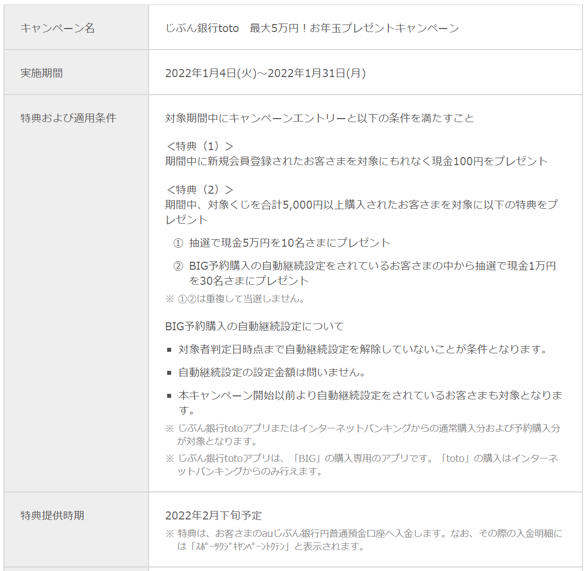 本キャンペーンでは、キャンペーン期間内に対象のスポーツくじ「BIG」「toto」を一定額以上購入されたじぶん銀行toto会員のお客さまを対象に、抽選で10名さまに現金5万円をプレゼントします。また、対象のお客さまのうちBIG予約購入の自動継続設定をされているお客さまの中から、抽選で30名さまに現金1万円をプレゼントします。さらに、期間中に新規会員登録されたお客さまには、もれなく現金100円をプレゼントします。
