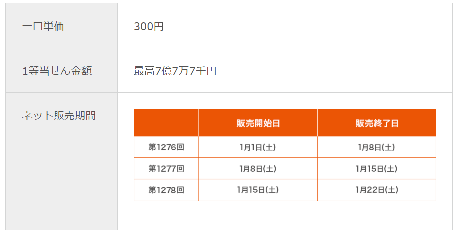 2022年1月1日から2022年1月22日の期間限定で、1等当せん金額が最高7億7万7千円となる特別なBIGも販売されます。